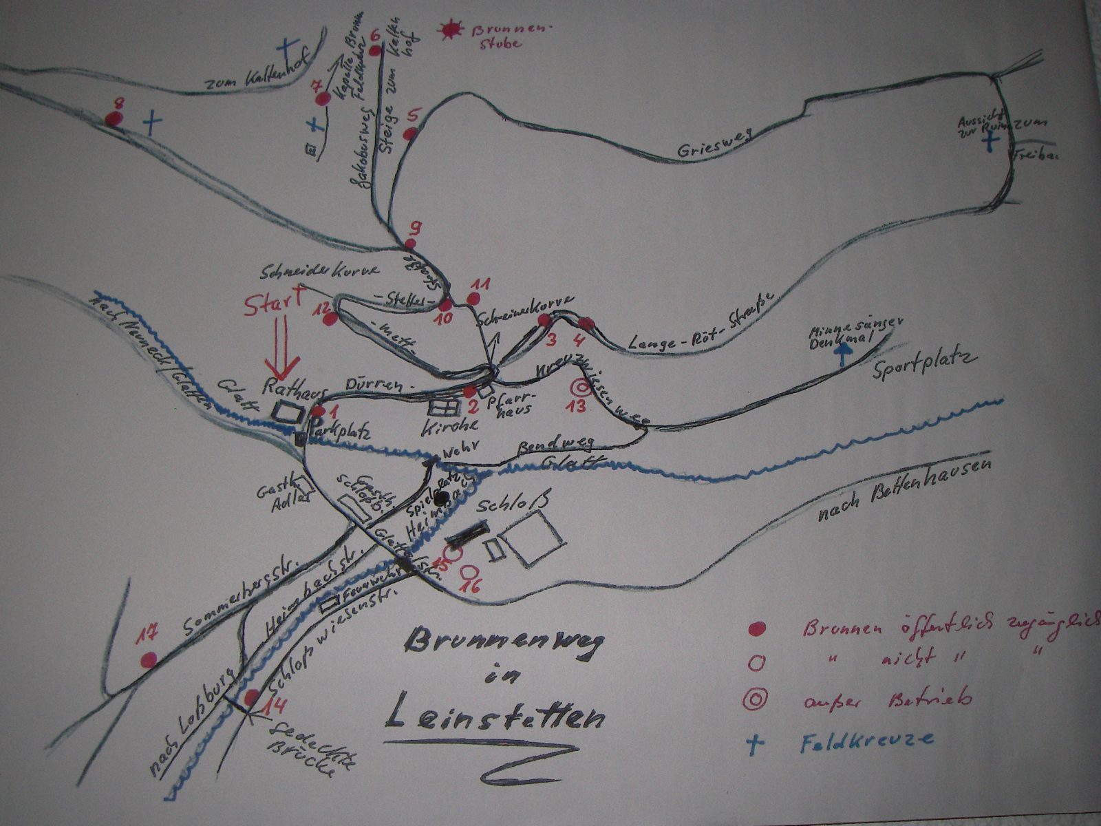 In Leinstetten gibt es 17 Brunnen, davon sind zwei nicht öffentlich zugänglich und einer ist stillgelegt.