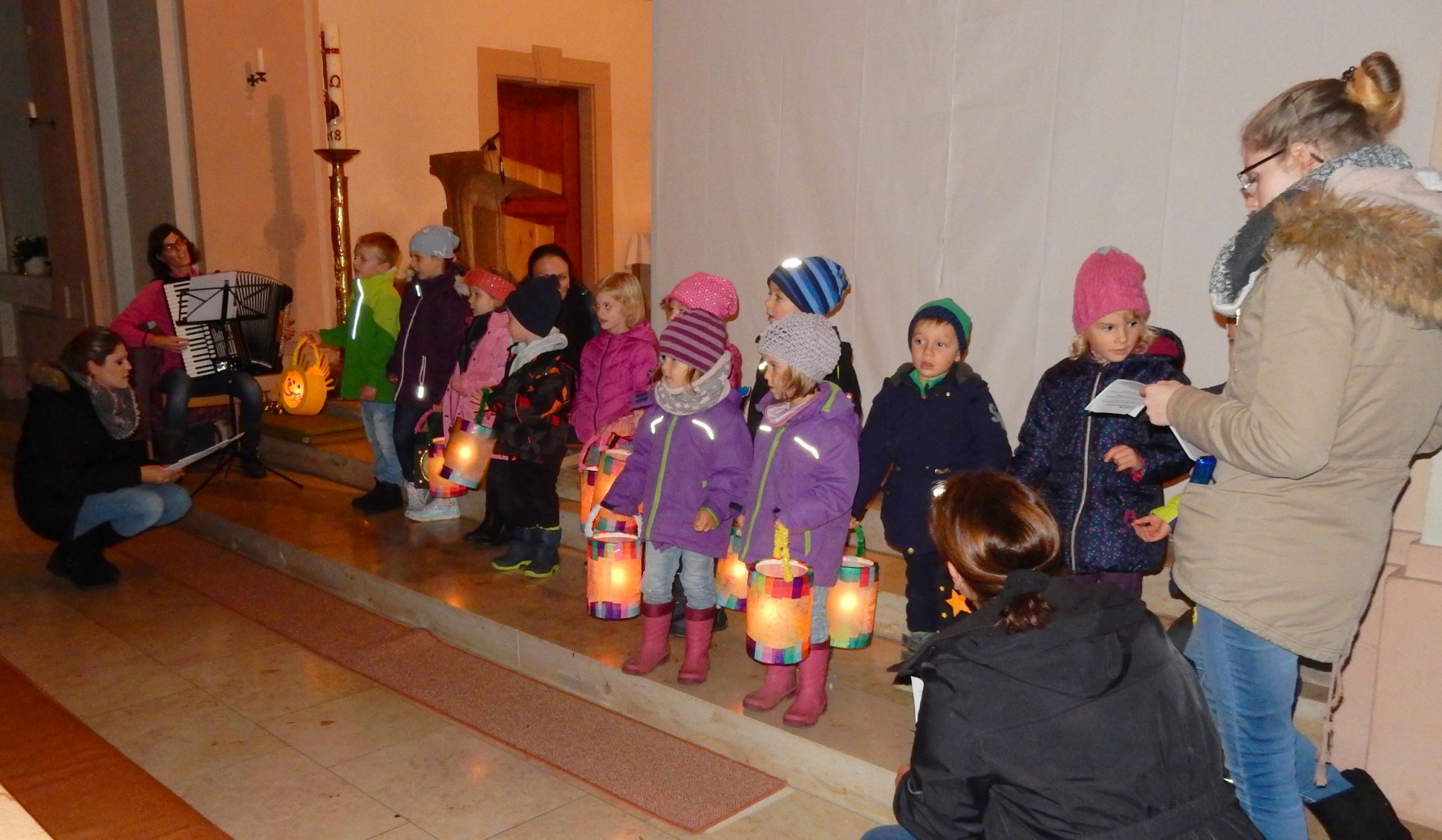 Bei Anbruch der Dunkelheit trafen viele Kinder mit ihren Eltern, Großeltern und Familienangehörigen aus Leinstetten und Bettenhausen in der Kirche St. Stephanus ein. Mit ihren Betreuerinnen zogen die Kindergartenkinder, in der Hand bunte Laternen zum Altar und sangen das Lied „wir feiern heut`ein Fest“. Begleitet wurden sie von Katrin Marte am Akkordeon.