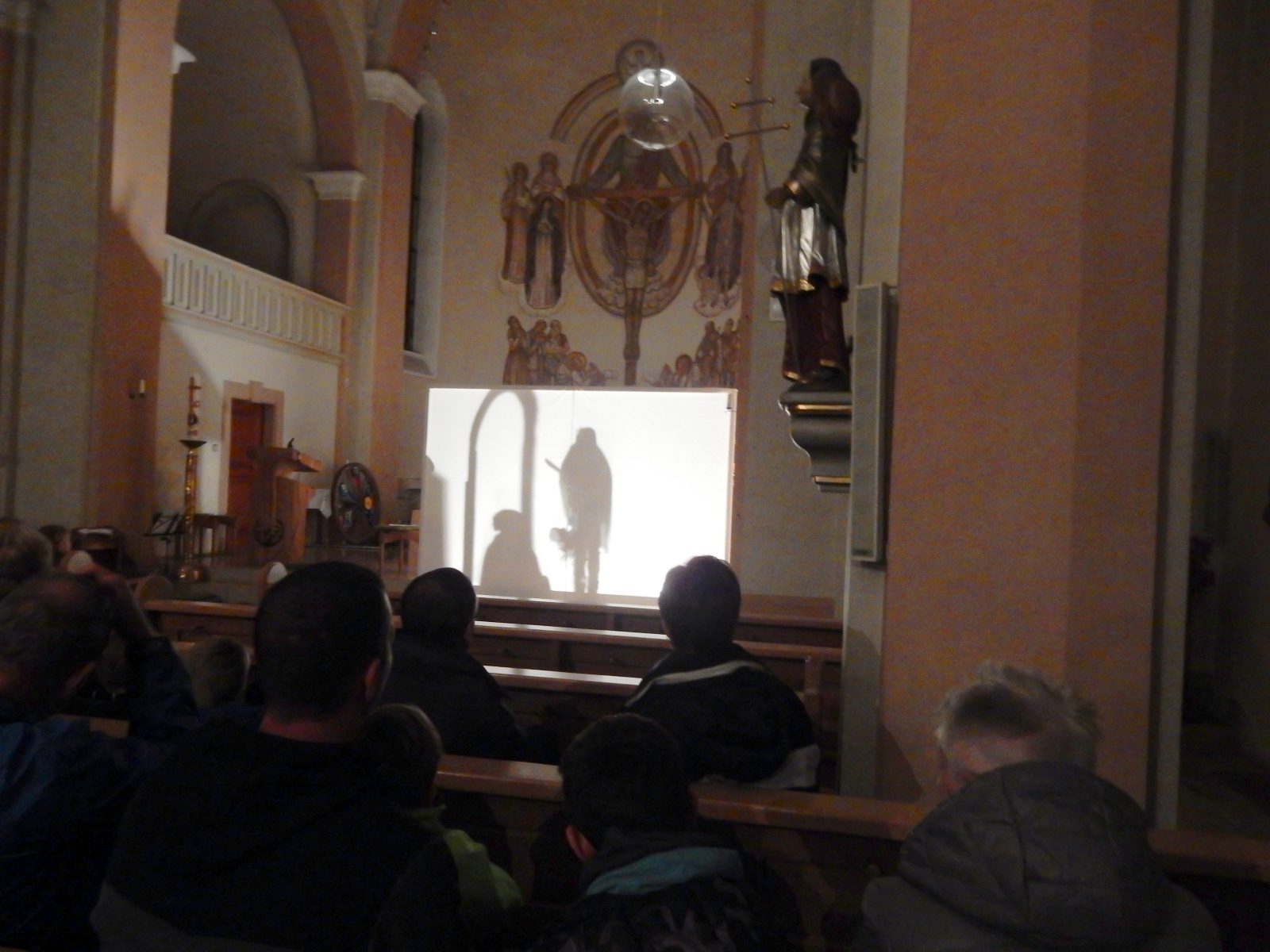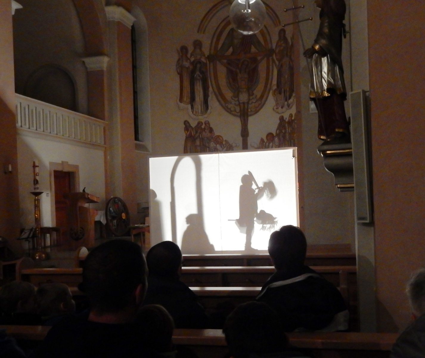 Eine große Wand im Altarraum war aufgestellt und als Schattenspiel stellten die Kinder das Leben des hl. Martin dar. Die passenden Texte dazu lasen abwechselnd die Betreuerinnen Tatjana Rheinberger und Liliana Gaus.