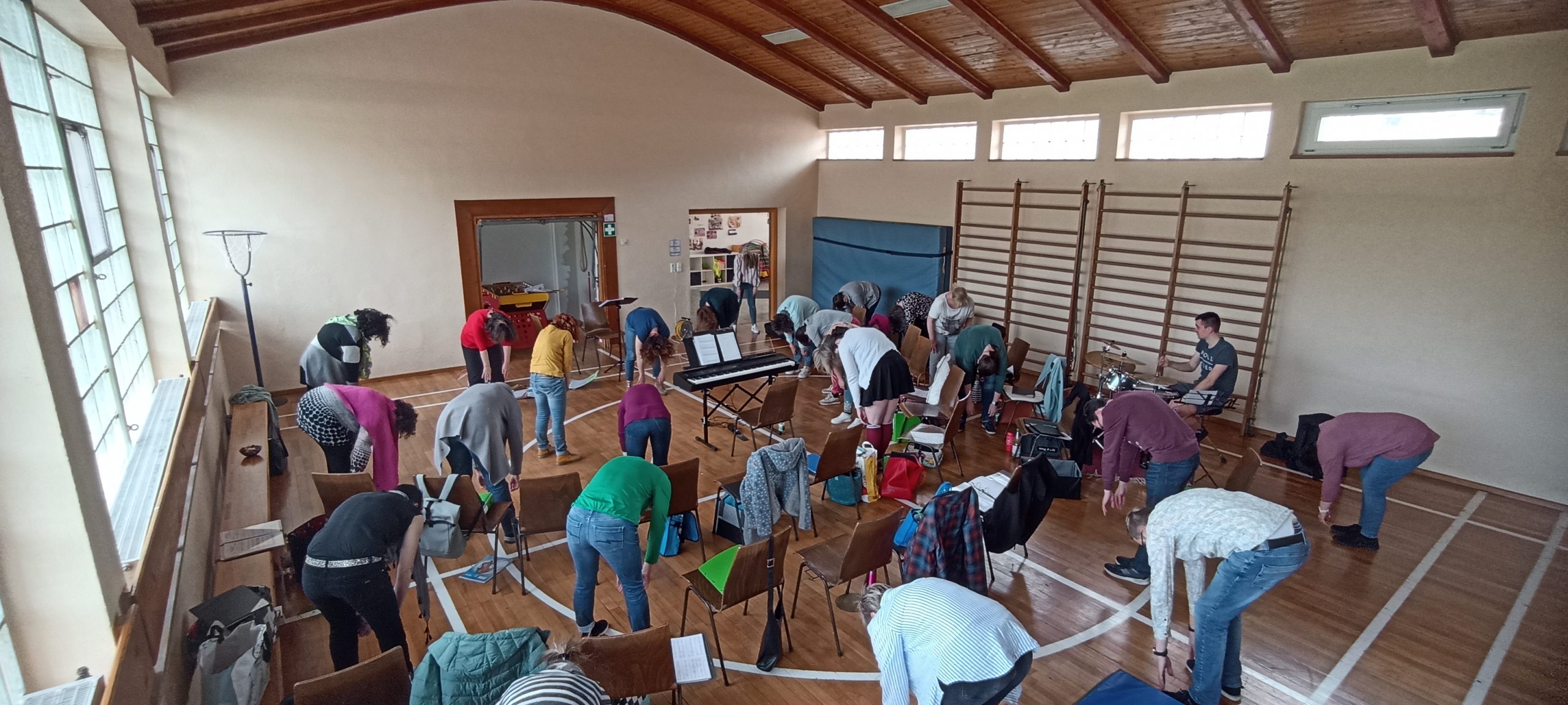 Einiges ist noch zu Organisieren. Doch am wichtigsten ist es natürlich, die Stimmbänder und unser „Instrument“ (= unseren Körper) bestmöglich vorzubereiten. Das tun wir, wie man auf den Bildern unten sehen kann, mit vollem Körpereinsatz!