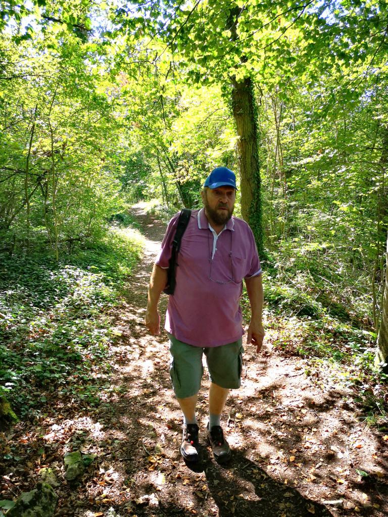 Der Kreislauf wurde schon nach wenigen Metern angeregt, denn der Anstieg hinauf zum Schlossberg war recht steil. Durch wilden Laubwald schlängelte sich der Pfad am Hang hinauf. Fast oben ein Zeltpavillon, eine junge Frau, prima, das musste eine Verpflegungsstation für verschwitzte Rentner sein. Weit gefehlt. Die Dame war beschäftigt mit dem Ausgraben alter Mauerreste rund um den Schlossberg. Nein, dafür blieb den Wanderern keine Zeit, denn Wanderführer Bruno war bereits wieder außer Sichtweite und man durfte ja den Anschluss nicht verpassen. Gut, erfahrene Spurenleser konnten sich bei genauem Betrachten des Bergpfades an dem von Bruno losgetretenem Gestein, an den Löchern vom Einsatz seiner Wanderstöcke und an den feuchten Flecken, die seine Schweißtropfen hinterließen, durchaus orientieren.