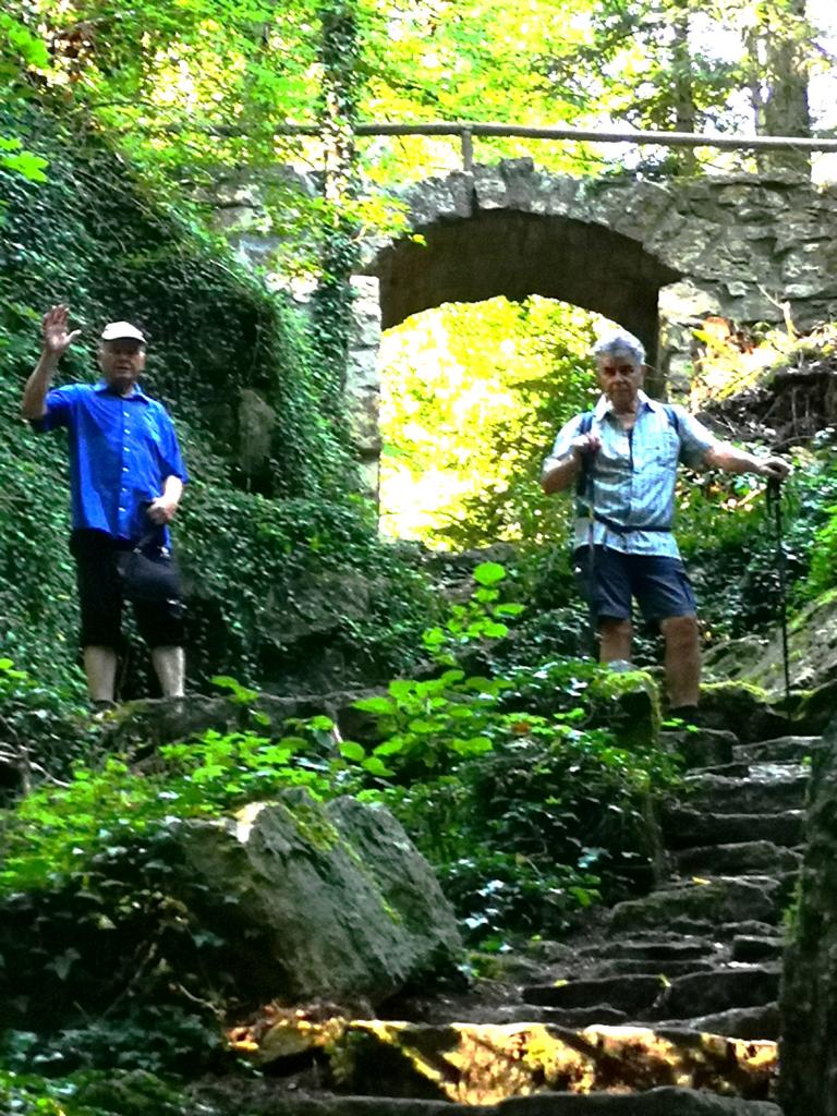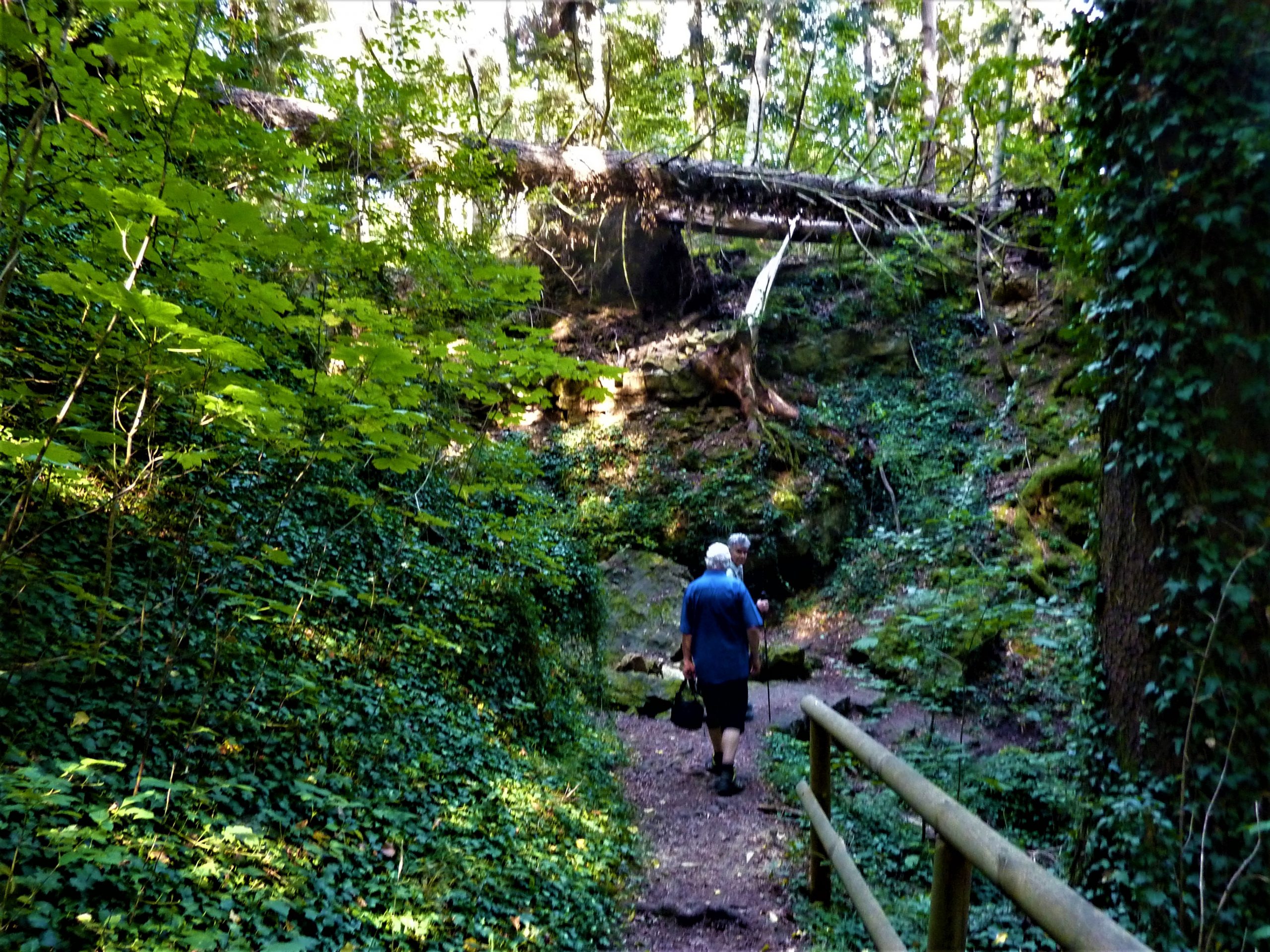 Von Wölfen weit und breit keine Spur, aber auch so war der Abstieg nicht ungefährlich. Steile, unförmige Stufen, feuchte Tritte, lose Steine, umgestürzte Bäume, es war fast hochalpines Gelände. Und trotzdem waren alle begeistert und mit Freude unterwegs. Am Ende der Schlucht dann das Quellhaus des angeblich so heilsamen Wassers. Vor Jahren durfte man hier nach der schweißtreibenden Wanderung seinen Durst löschen. Und jetzt? Was für eine Schande, jetzt steht da nur noch ein Getränkeautomat, was soll man davon halten. Bad Niedernau, Römerquelle, Heilquelle?!