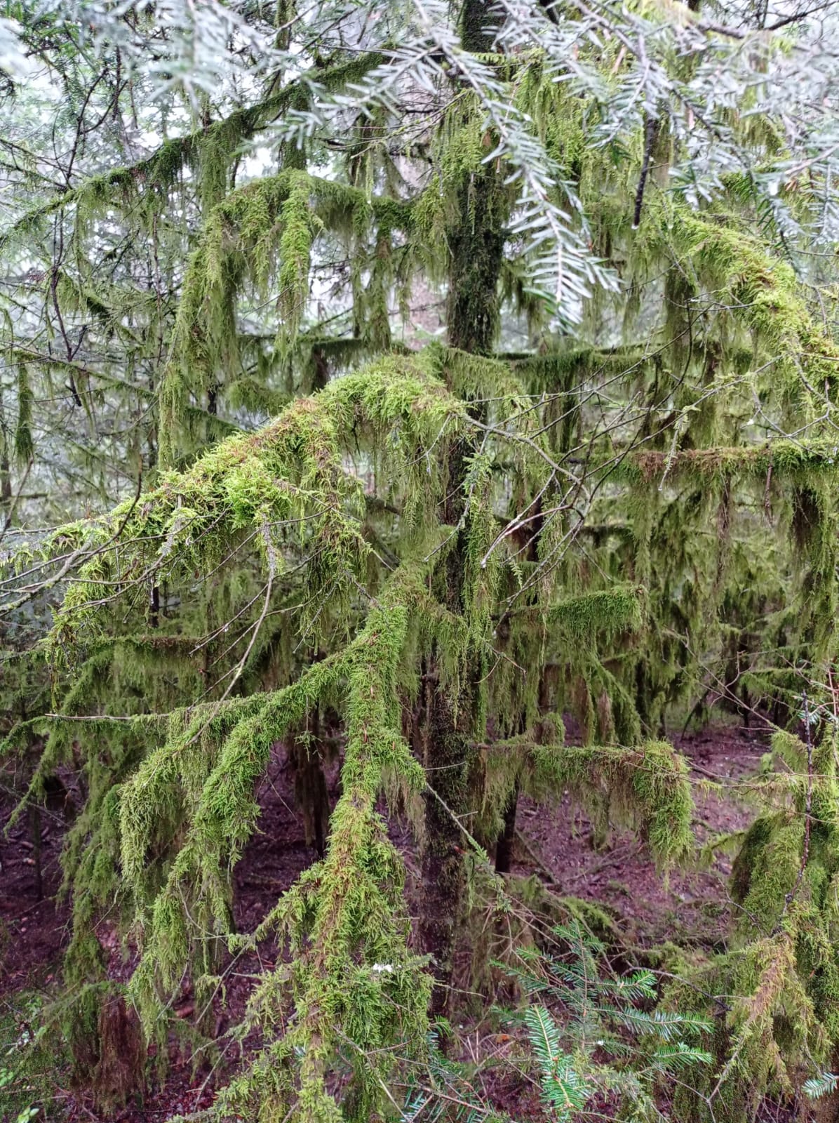 Ein Märchenwald. Moosbewachsene Bäume, braunes, absterbendes, hüfthohes Farn, Heidelbeersträucher, zauberhaft.