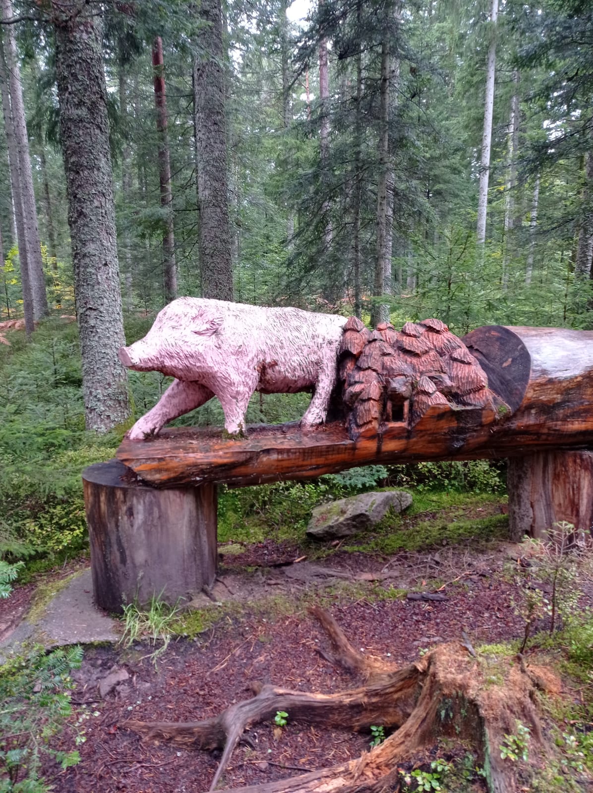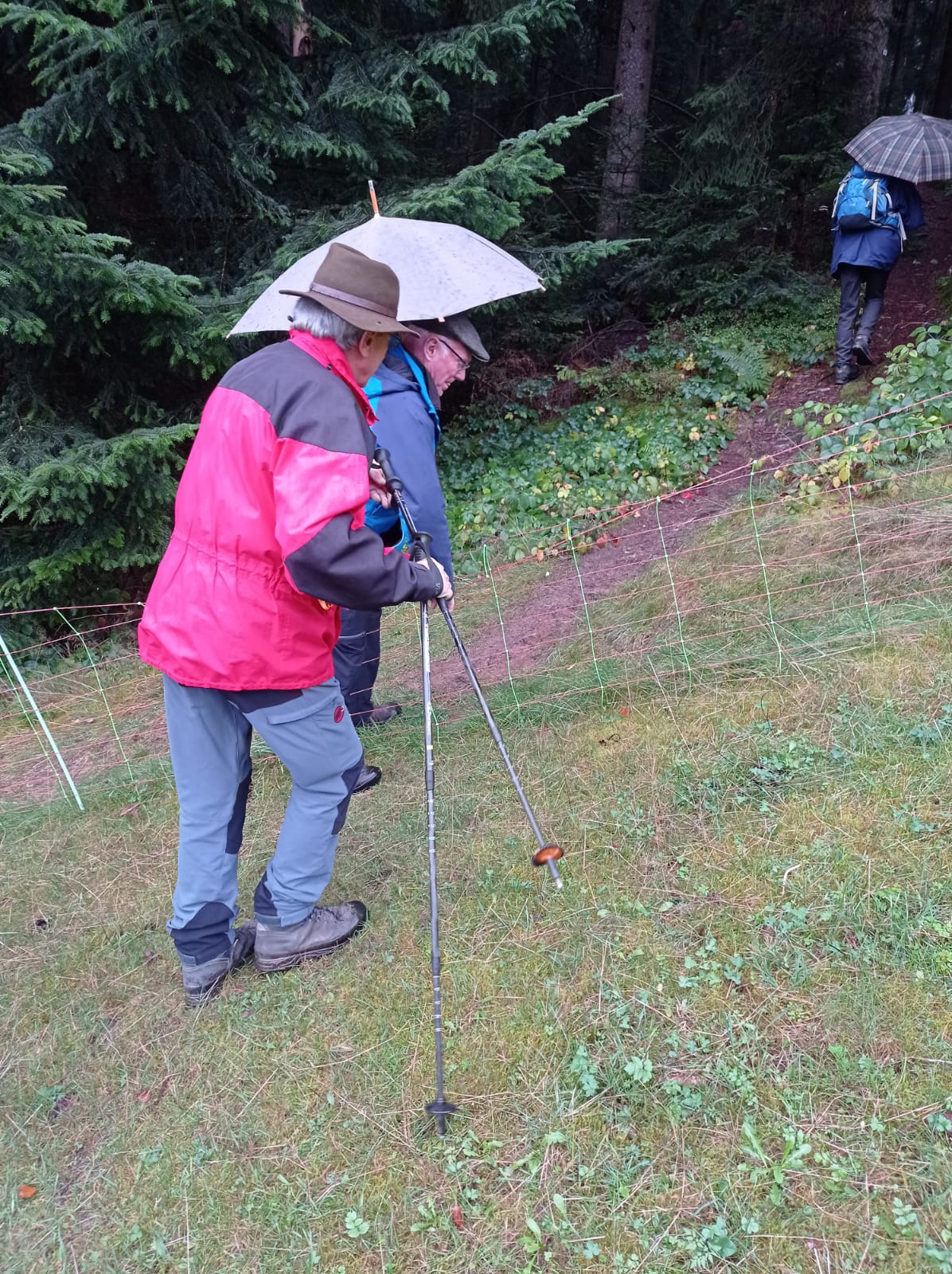 Vorbei am Hoteleingang galt es nun die Skipiste am Stokinger Hang zu überqueren. Am Weidezaun musste die Entscheidung getroffen werden, mit einem Sprung elanvoll drüber oder testen, ob überhaupt Strom angeschlossen war. Unter Lebensgefahr griff Hans mit seinen hageren Lehrerfingern mutig in die Maschen. Keine sprühenden Funken, kein Aufschrei, also runterdrücken und drüber. Ein traumhafter Wanderpfad führte hinein in den Freudenstädter Stadtwald.