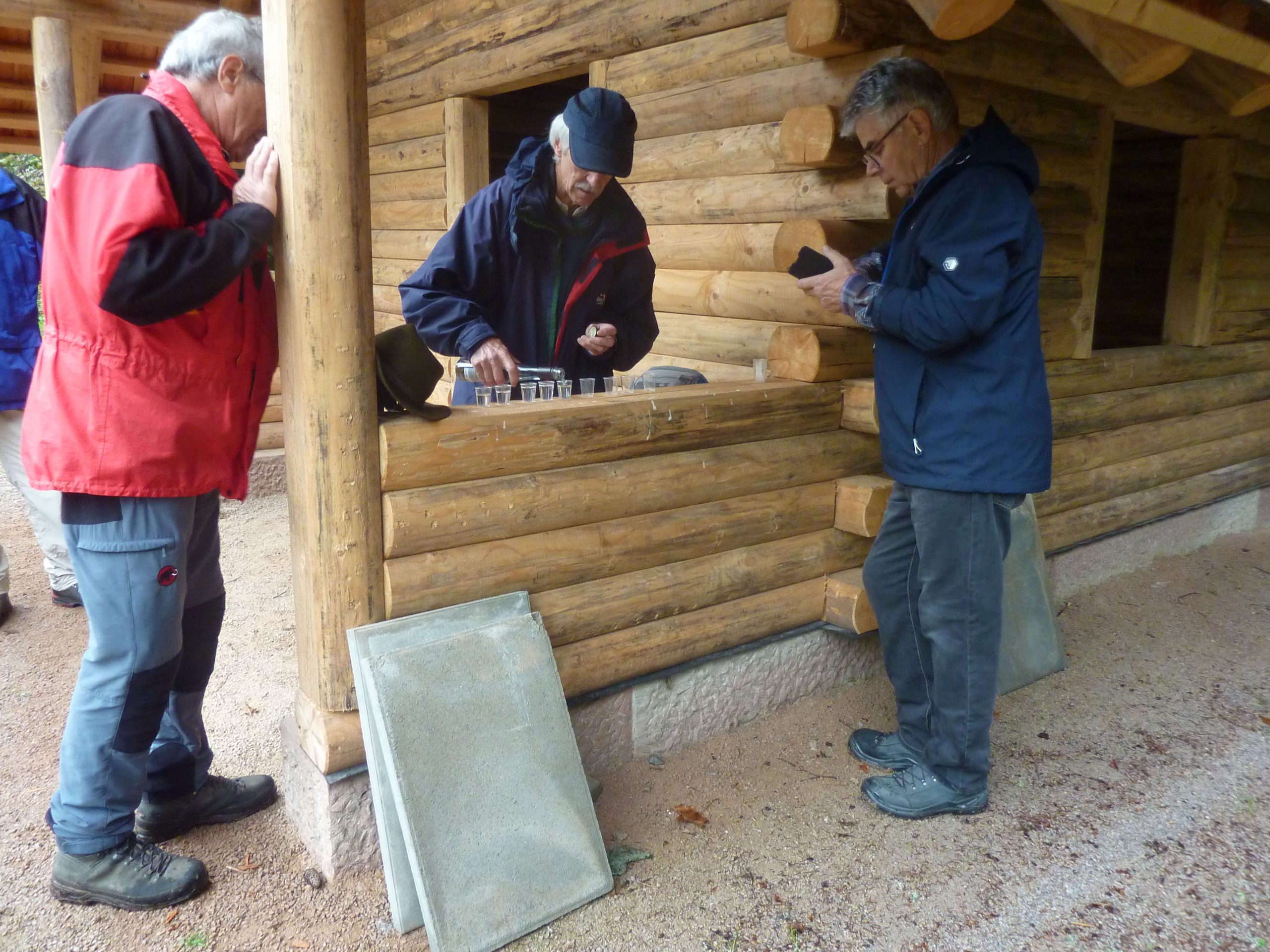 Von wetterbedingten Abkürzungen war keine Rede mehr, denn die Schirme waren längst zu Gehstöcken umfunktioniert worden. An einer wunderschönen Blockhütte bat Hans um ein kleines Päuschen. Gerne, zumal er seinen Rucksack öffnete und ein Fläschchen vom Alde Gott Kirschwasser hervorholte. „Du bisch doch an allmachts Knicker“, reklamierte Bruno, weil sein Gläsle nicht randvoll war. Der Rest kippte das willkommene Schnäpsle mit einem dankbaren “Prosit“ in den Schlund.