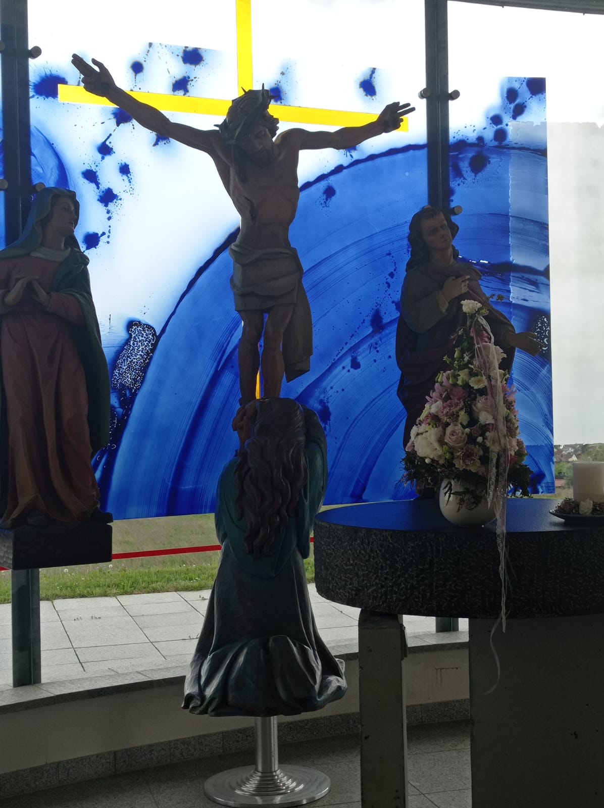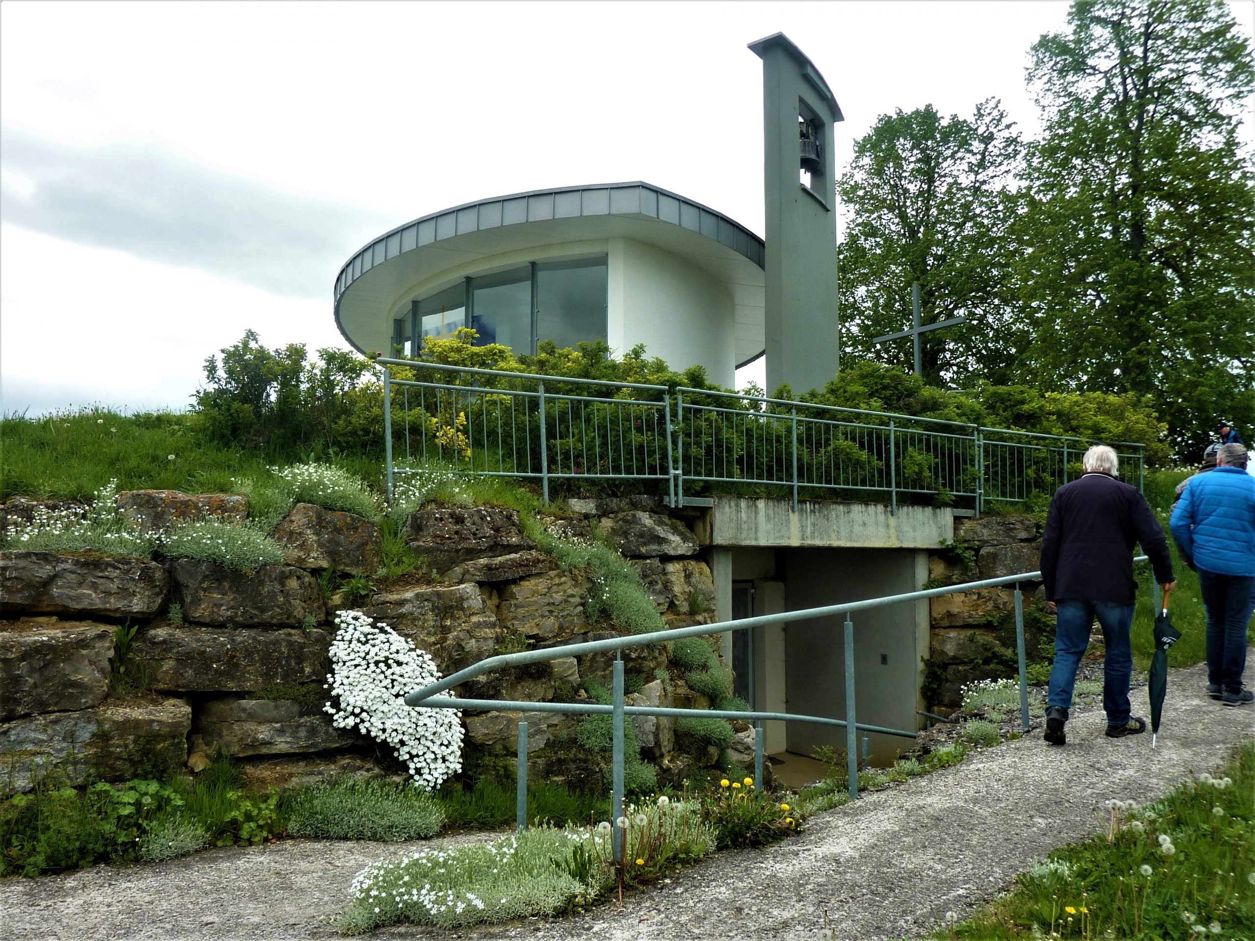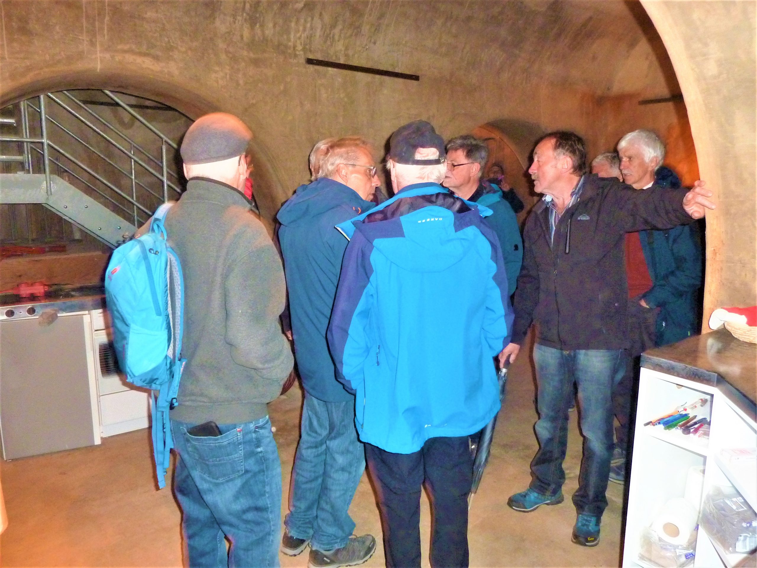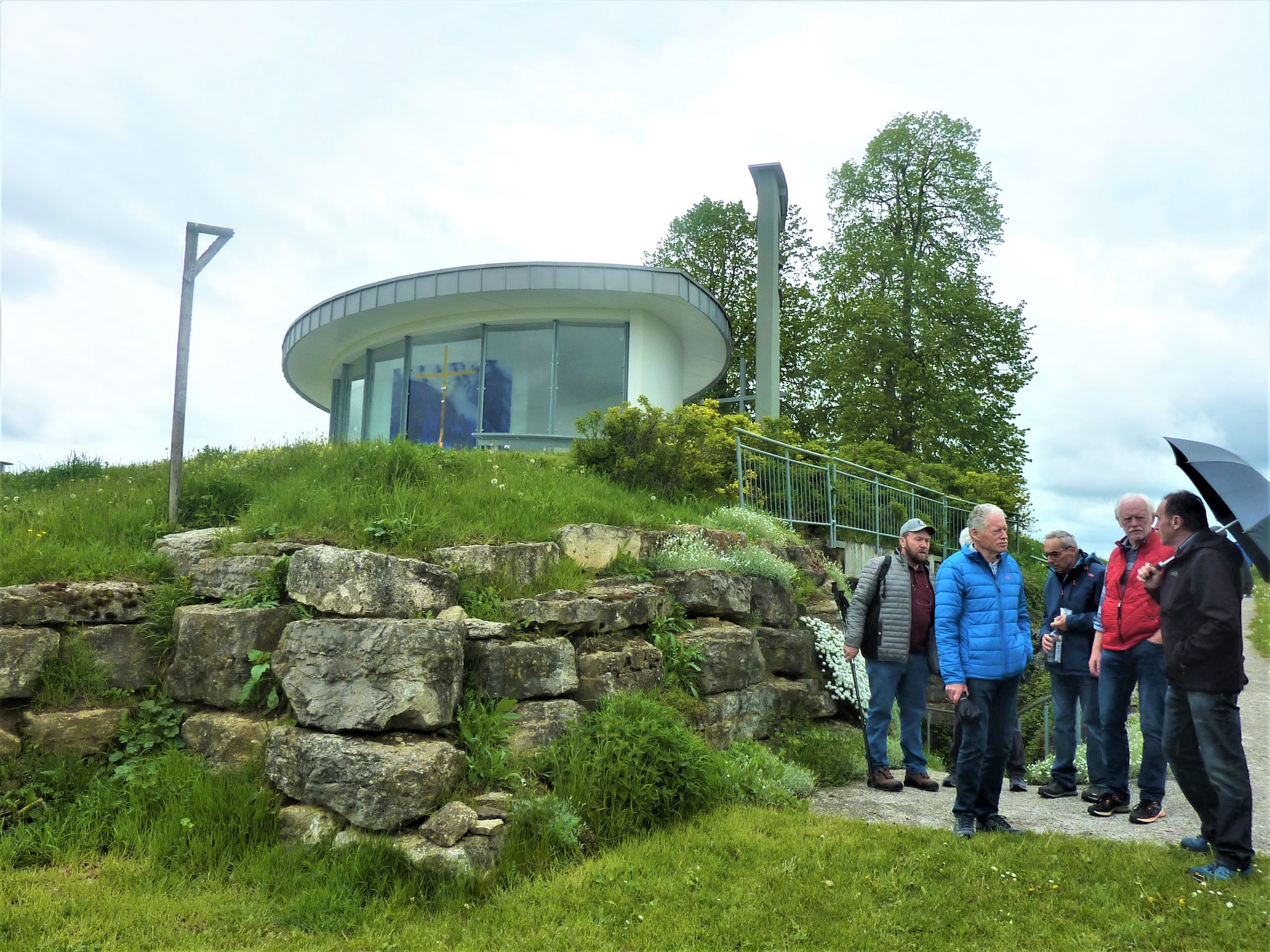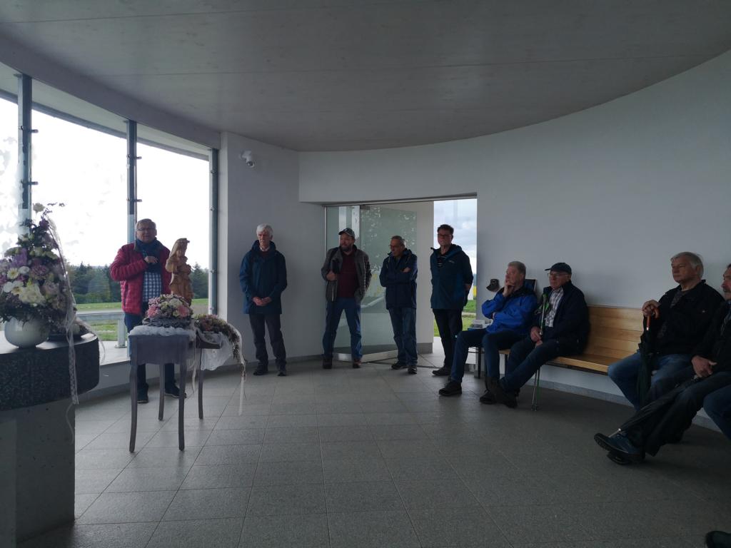 Auch das Innere der Kapelle, das durch den Rottweiler Künstler Tobias Kammerer gestaltet wurde, war sehr eindrucksvoll. Die Glasfront um den Altar erlaubt den Gläubigen auch während der Messe einen schönen Ausblick in Gottes freie Natur. Nach dem gemeinsamen Singen des Liedes “Großer Gott wir loben dich“ ging es noch hinunter in die Katakomben, in deren Gewölbe jährlich auch Kunstausstellungen stattfinden. Ein letzter Blick zum Glockenturm, ein Gruppenfoto auf der Treppe neben der rustikalen Christophorus Statue und zum Abschied ein Schnäpsle von Lothars Kollegen und Freund.