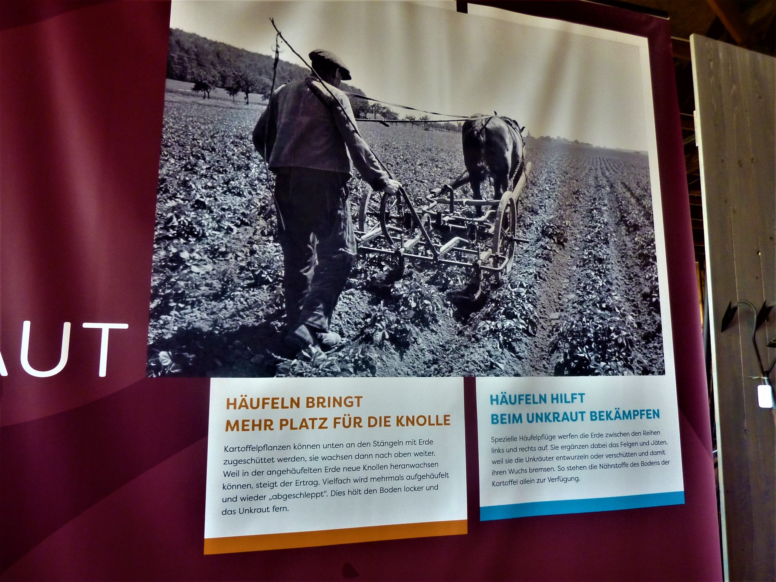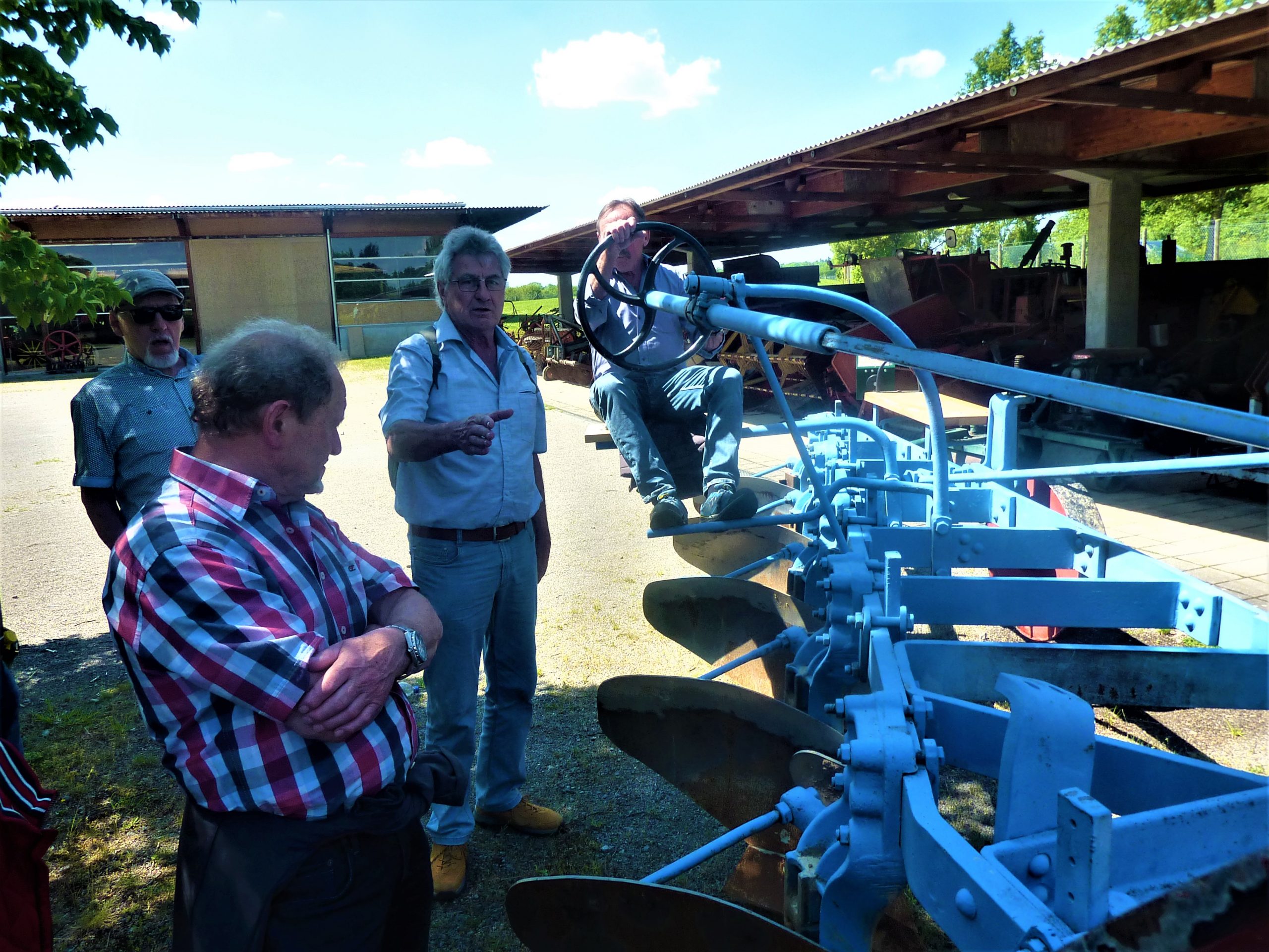 Dass sich Ludwig als Kenner der Gebräuche und Abläufe der Landwirtschaft vor ungefähr sechs Jahrzehnten zu erkennen gab, war schon etwas verwunderlich. Ebenso die Aussage von Dr. Weisser, dass heutzutage kaum noch gepflügt wird, sondern Direktsaat praktiziert wird. Das heißt, dass ohne jegliche Bodenbearbeitung seit der vorangegangenen  Ernte mit speziellen Direktsämaschinen das Saatgut abgelegt wird. Danach durfte man erfahren und bestaunen wie man früher Kartoffeln mühsam von Hand gepflanzt und geerntet hat und wie heute Maschinen die Arbeit erleichtern. Erinnerungen wurden ausgetauscht, wie es bei der Kartoffelernte in der Schulzeit zuging. Es wurden damals Kartoffelferien angeordnet, damit die Kinder beim Auflesen mithelfen konnten. Auf dem Innenhof zwischen den Hallen war ein riesiger Pflug aufgebaut, der von zwei Dampfmaschinen, die sich am Ende riesiger Äcker gegenüber standen, hin und her gezogen wurde. Unvorstellbar.