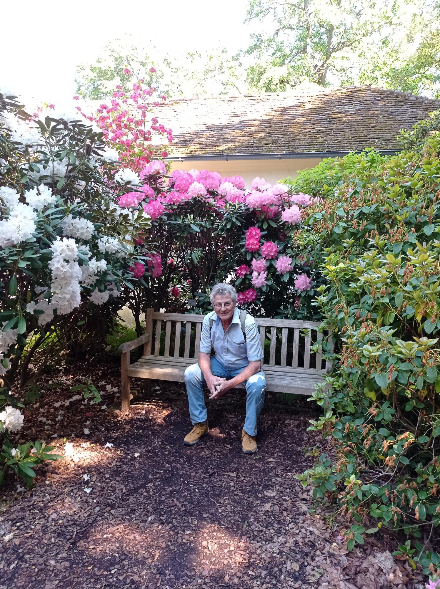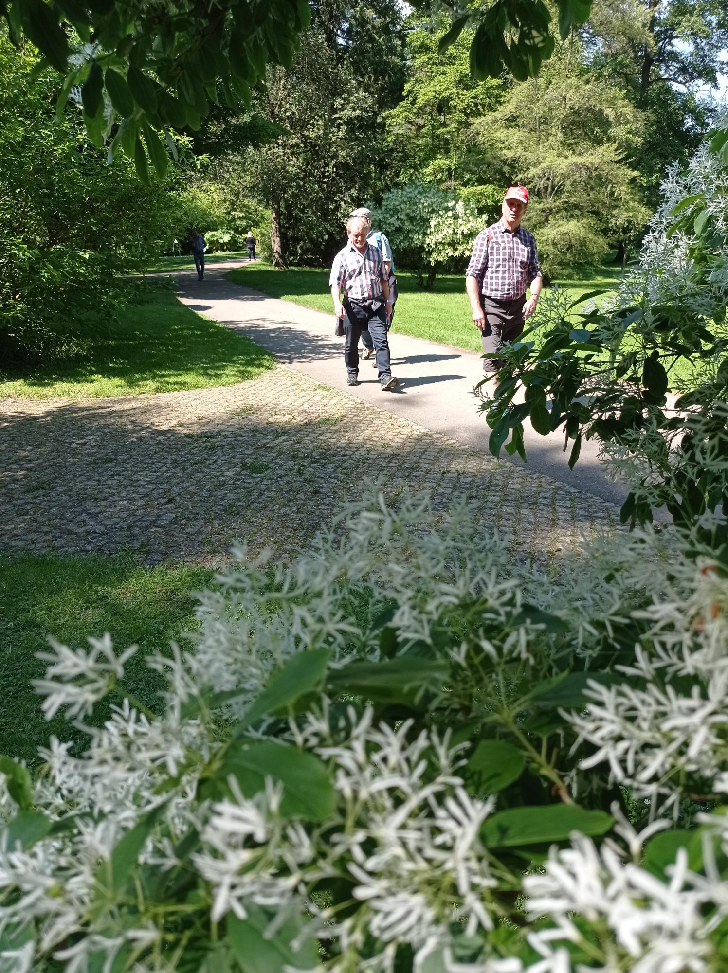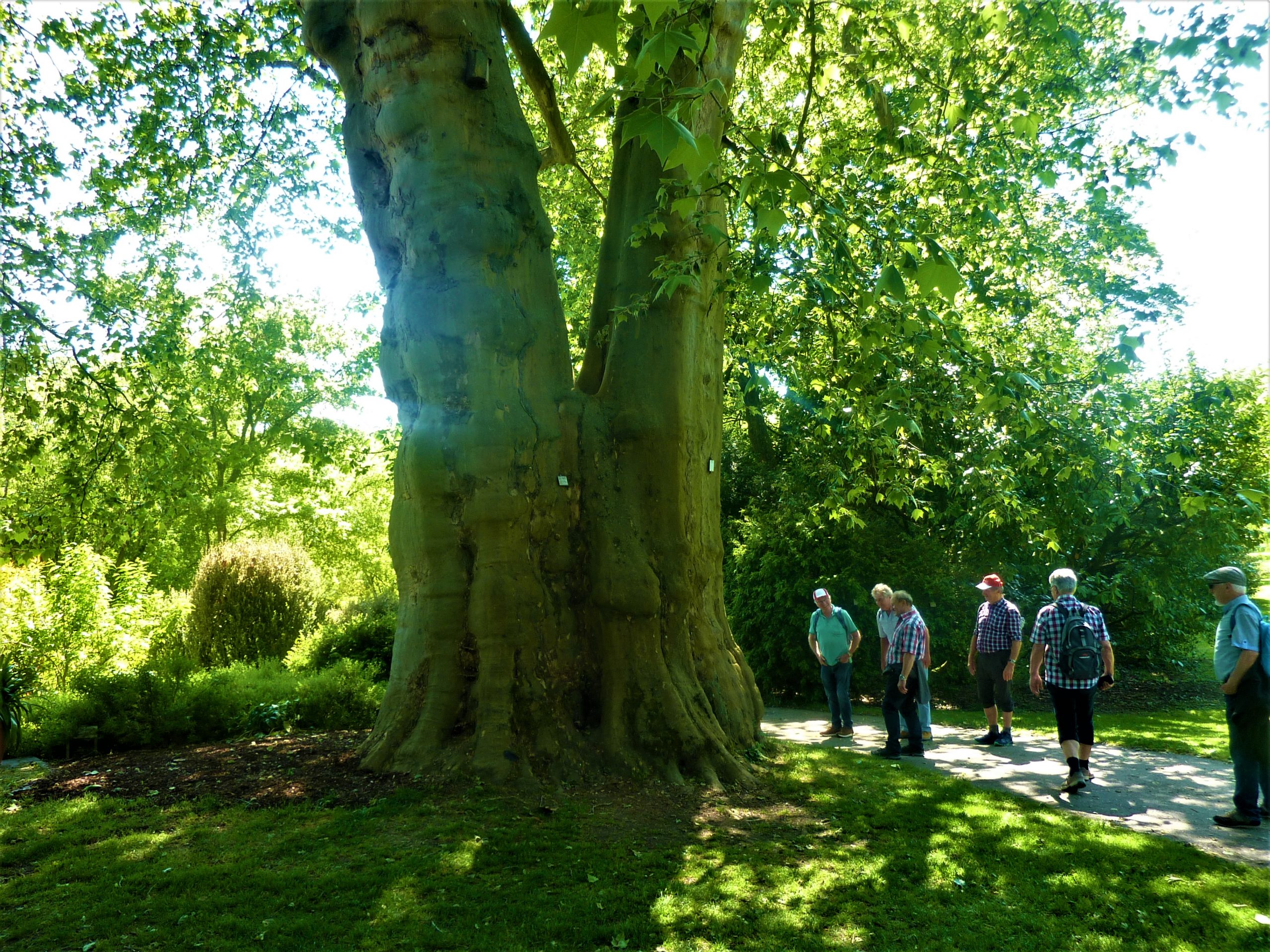 Diese konnten unter vielen anderen Oldtimer-Traktoren in der nächsten Halle bewundert werden. Am Ende des Rundganges wurden Erntemaschinen von heute und Mengele-Dreschmaschinen von früher präsentiert. Damit war die Führung  beendet, Dr. Weisser bedankte sich für die Aufmerksamkeit und verabschiedete sich. Die erschöpften DienstagsWanderer begaben sich zum nächsten Programmpunkt, dem unweit gelegenen “Botanischen Garten“. Es tat richtig gut, endlich die vom Stehen schmerzenden Beine zu bewegen. Es gab einzigartige Bäume und Sträucher zu bewundern.