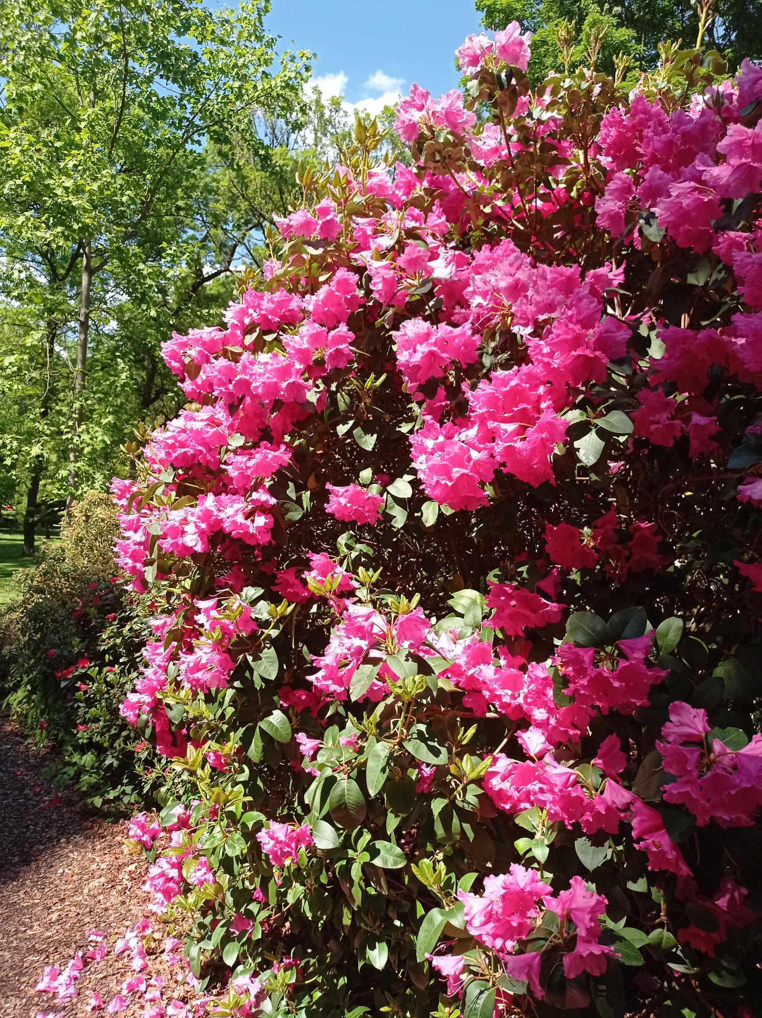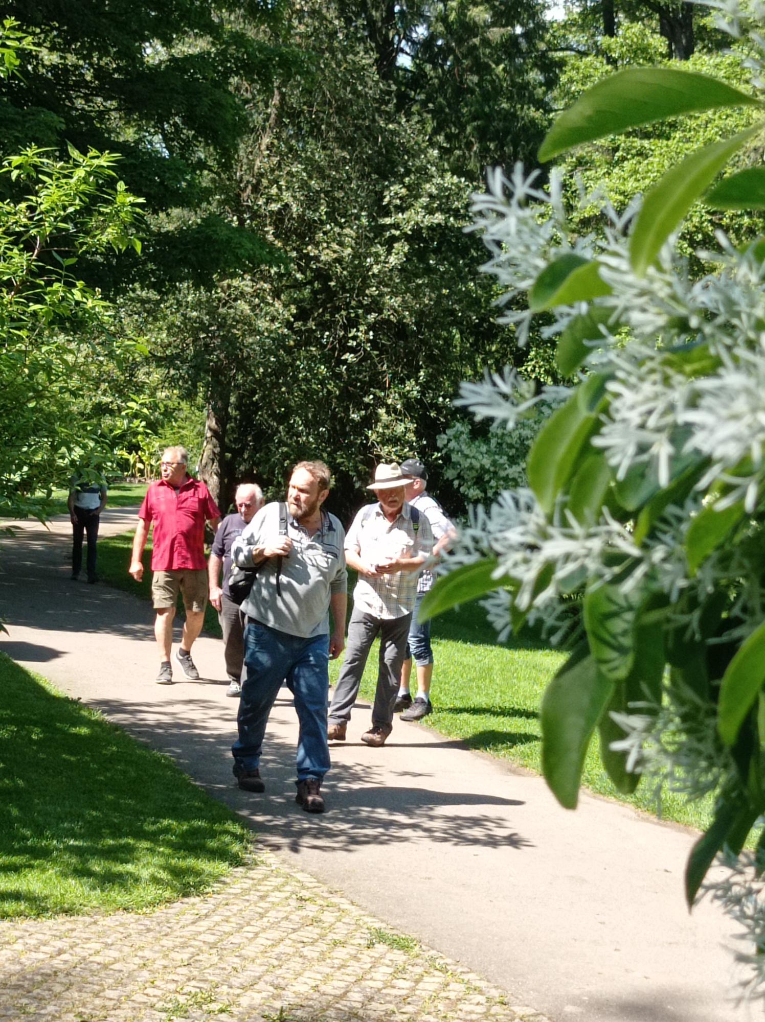 Diese konnten unter vielen anderen Oldtimer-Traktoren in der nächsten Halle bewundert werden. Am Ende des Rundganges wurden Erntemaschinen von heute und Mengele-Dreschmaschinen von früher präsentiert. Damit war die Führung beendet, Dr. Weisser bedankte sich für die Aufmerksamkeit und verabschiedete sich. Die erschöpften DienstagsWanderer begaben sich zum nächsten Programmpunkt, dem unweit gelegenen “Botanischen Garten“. Es tat richtig gut, endlich die vom Stehen schmerzenden Beine zu bewegen. Es gab einzigartige Bäume und Sträucher zu bewundern.