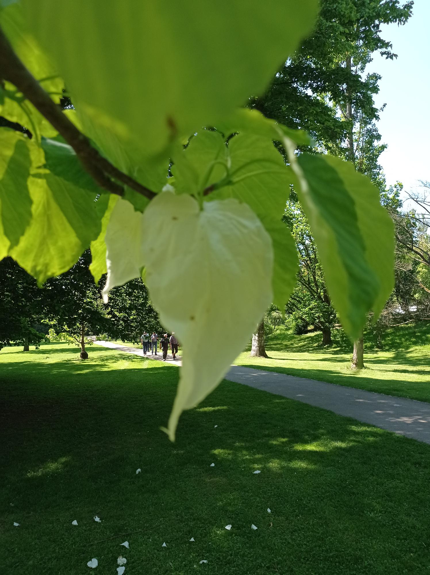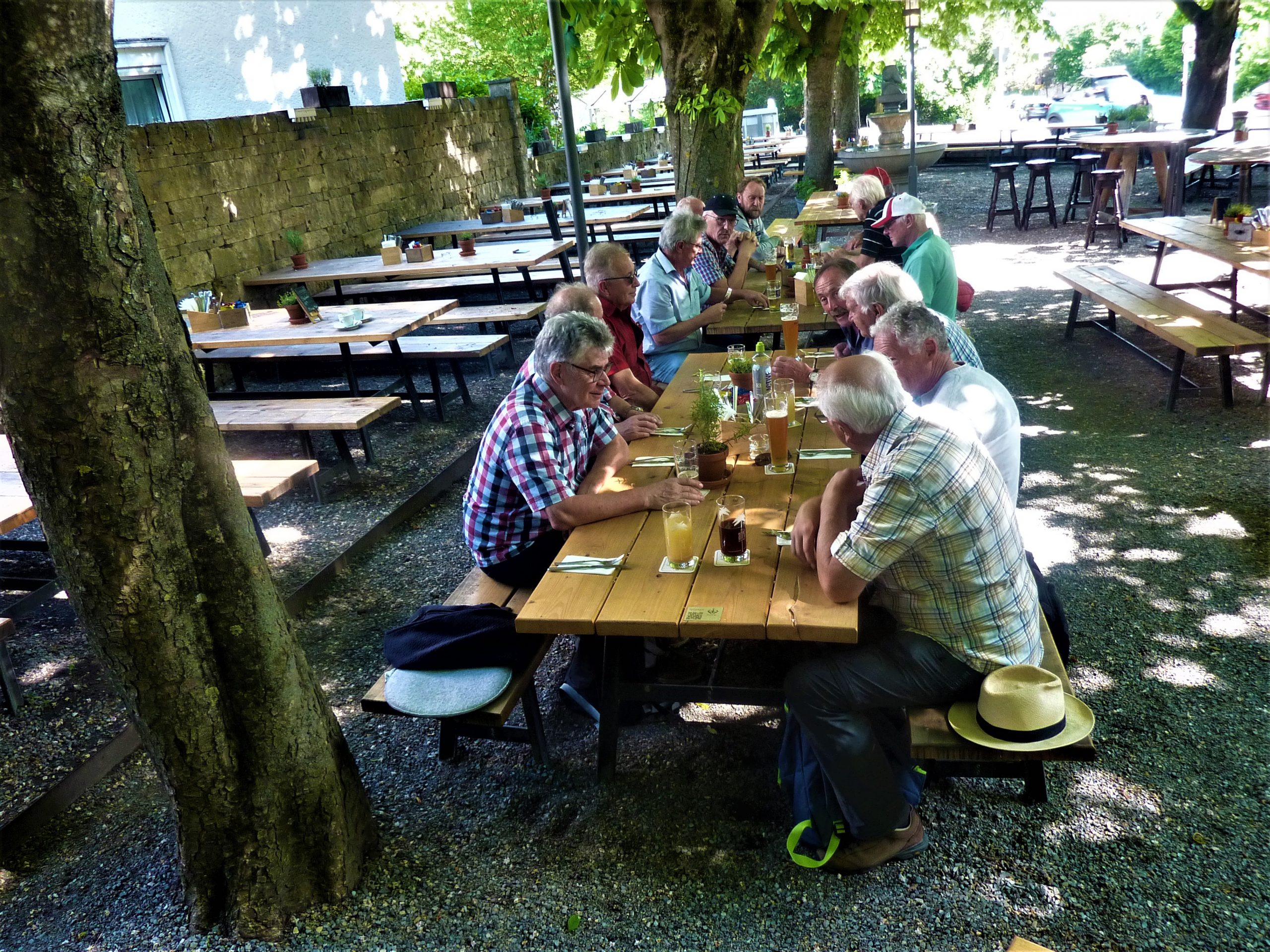 Der Chinesische Schneeflockenbaum, die uralte Platane, der blühende Rhododendronbusch, eine unglaubliche Vielfalt an Pflanzen. Aber was ist schlimmer als Heimweh? Durst! Und mit dem Wissen, dass in der Gartenwirtschaft auf der anderen Straßenseite Tische für die DienstagsWanderer reserviert sind, waren alle erleichtert, als von Peter die Ansage “rechts weg und zurück“ zu hören war. Herrlich war es dann auch, im Schatten ausladender Kastanienbäume zu sitzen, ein Radler, leider nur 0,4 Ltr., ein Glas Wein, leider nur 0,2 Ltr., also kein Viertele oder ein Weizen, korrekt, 0,5 Ltr., zu genießen. Vom Preis her (hoffentlich liest das Tom nicht) hätte das Nullzwei-Viertele eine Flasche sein können. Trotzdem wurden genussvoll diverse Speisen wie Wurstsalat, Kutteln, Kässpätzle und Maultachen verzehrt. Herrlich. Einfach nur herrlich. Wie Sonntag! Aber alles hat ein Ende..