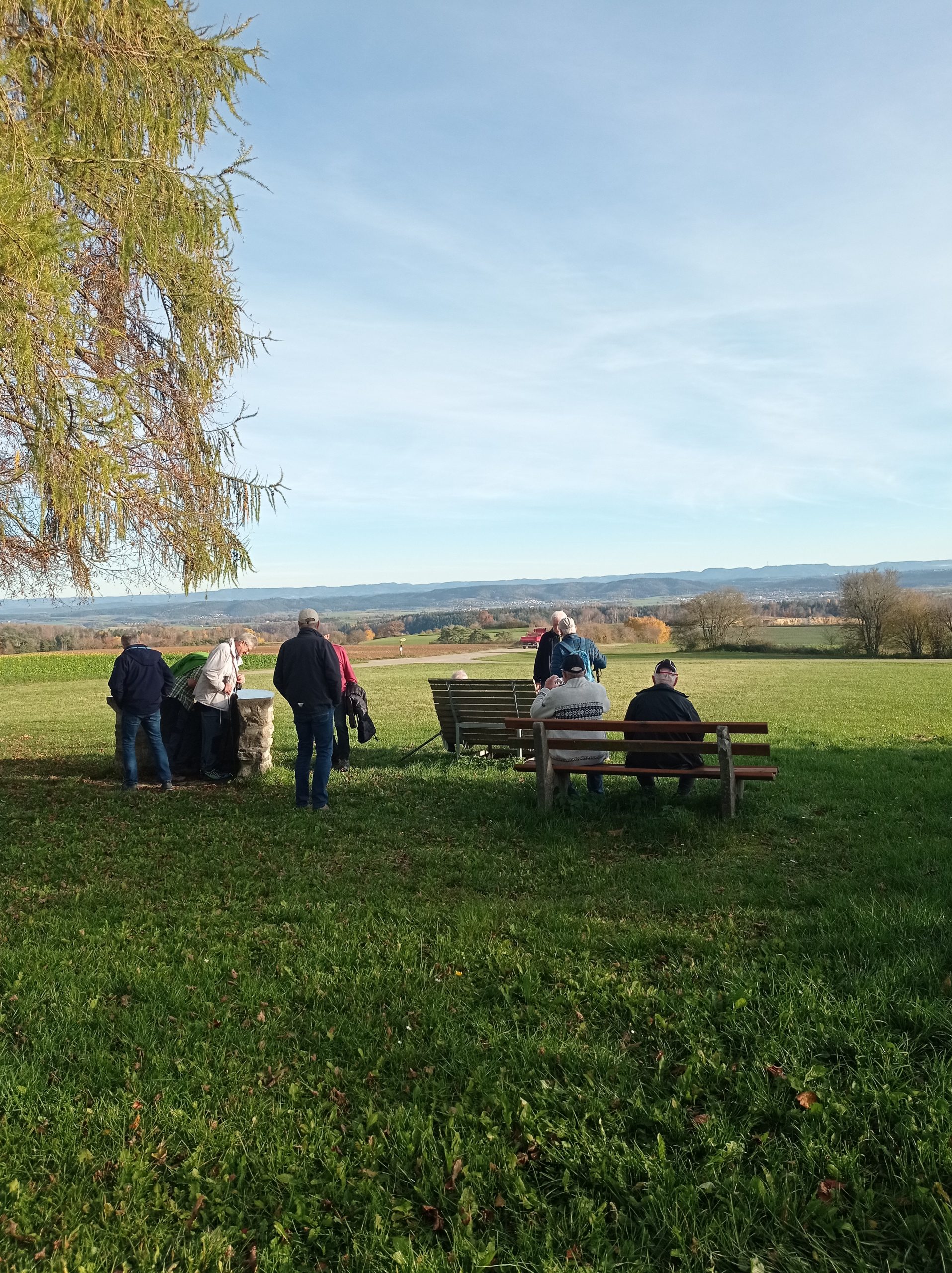 Dann endlich a Benkle, Sitzgelegenheiten, Pause. In aller Ruhe hinüberschauen zur Burg Hohenzollern, zum Raichberg, zum Lemberg, zum Albtrauf.