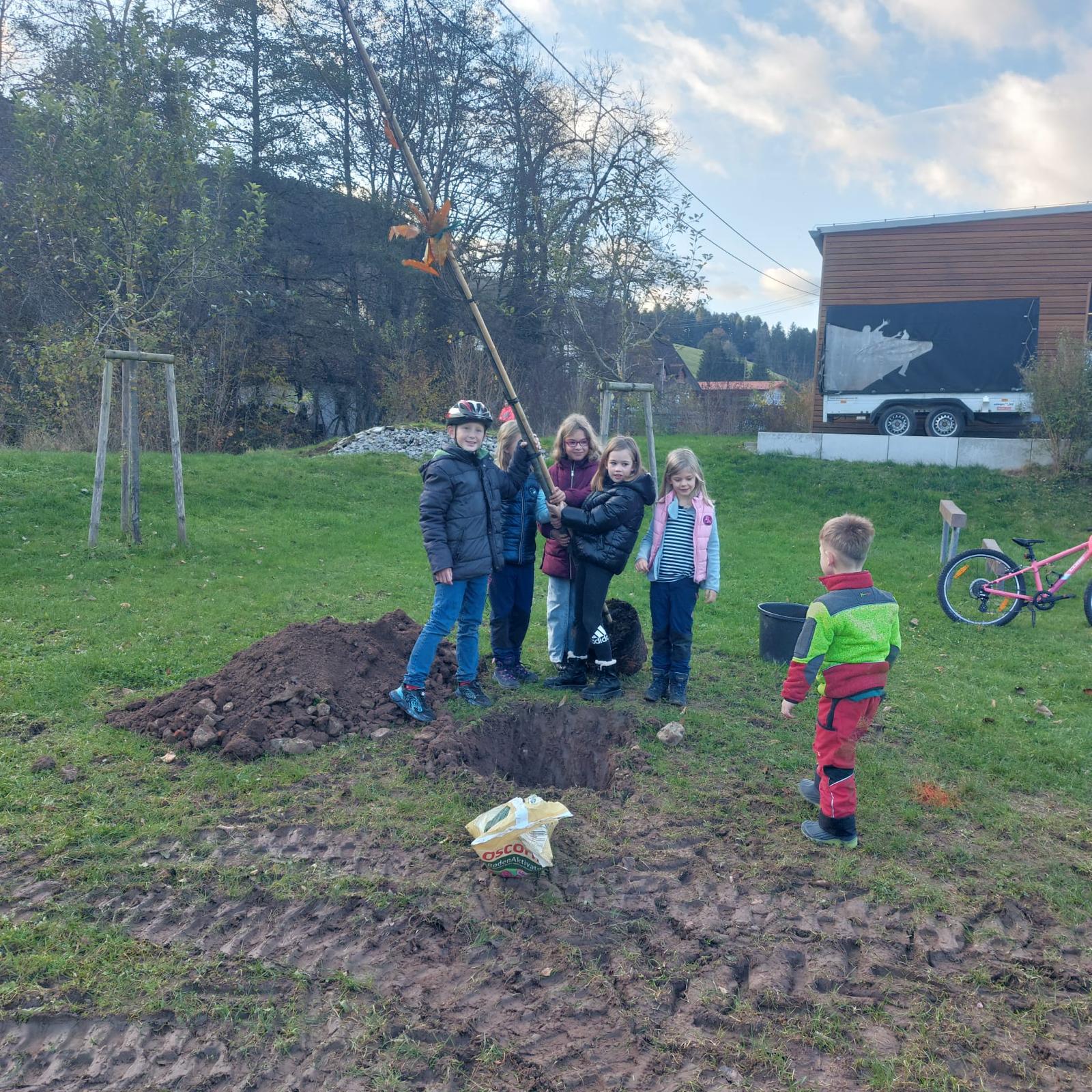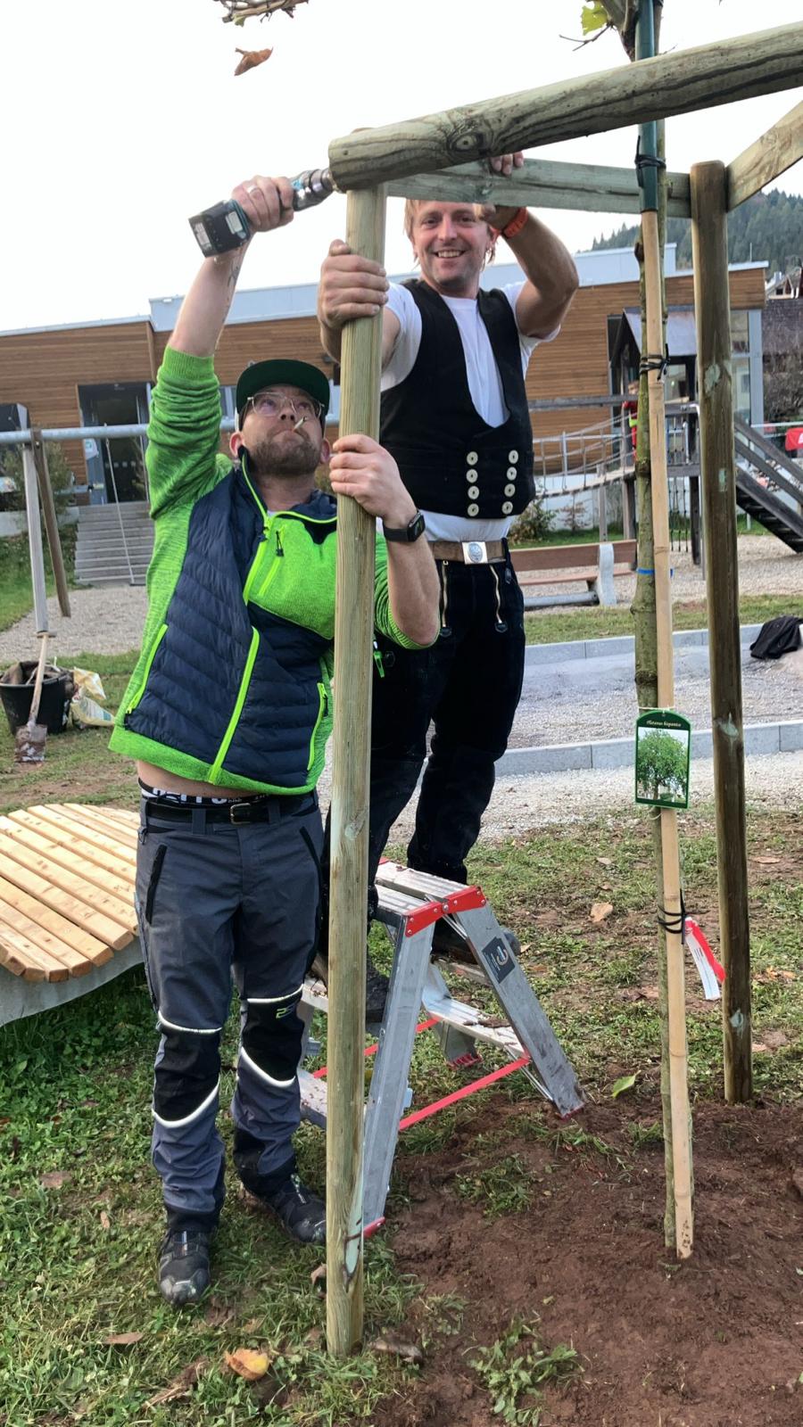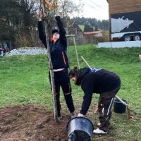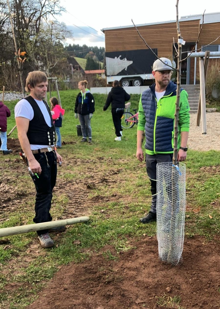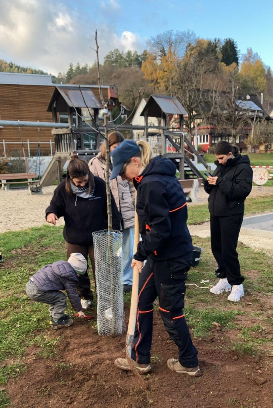 Tatkräftig waren Kinder, Eltern und Großeltern zur Stelle und halfen bei den ersten vorgesehenen Arbeiten mit. So wurde ein Stück ausgebaggert, um einen großen Sandkasten zu errichten. Mehr Sitzgelegenheiten wurden geschaffen und die Kinder pflanzten mit großem Eifer einen Kastanienbaum, welcher einmal Schatten spenden wird.