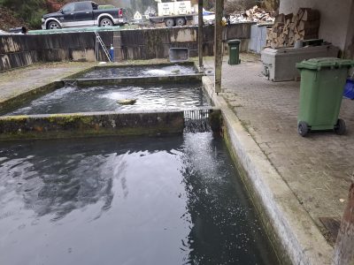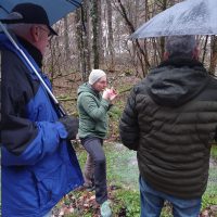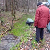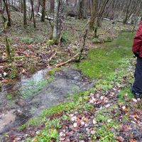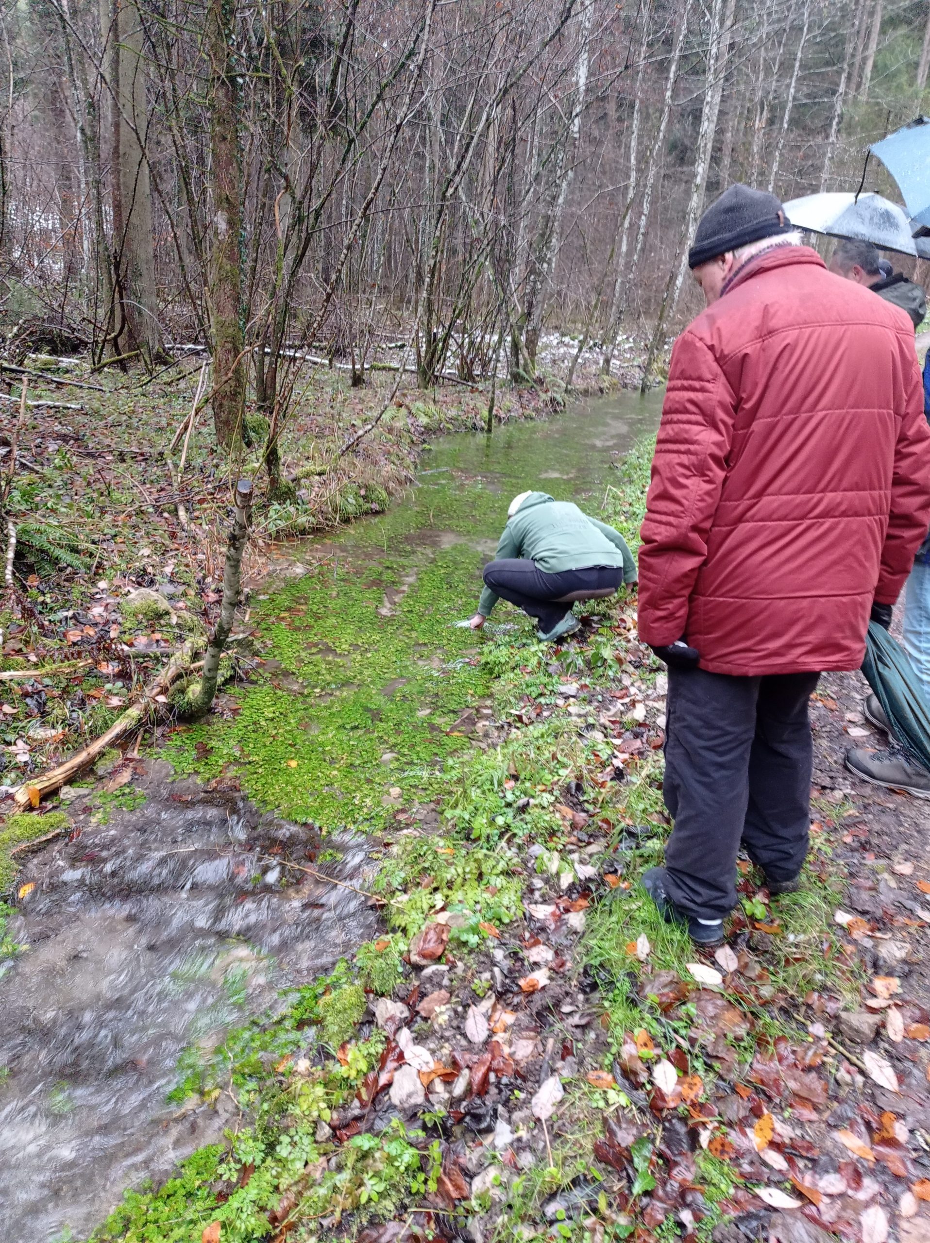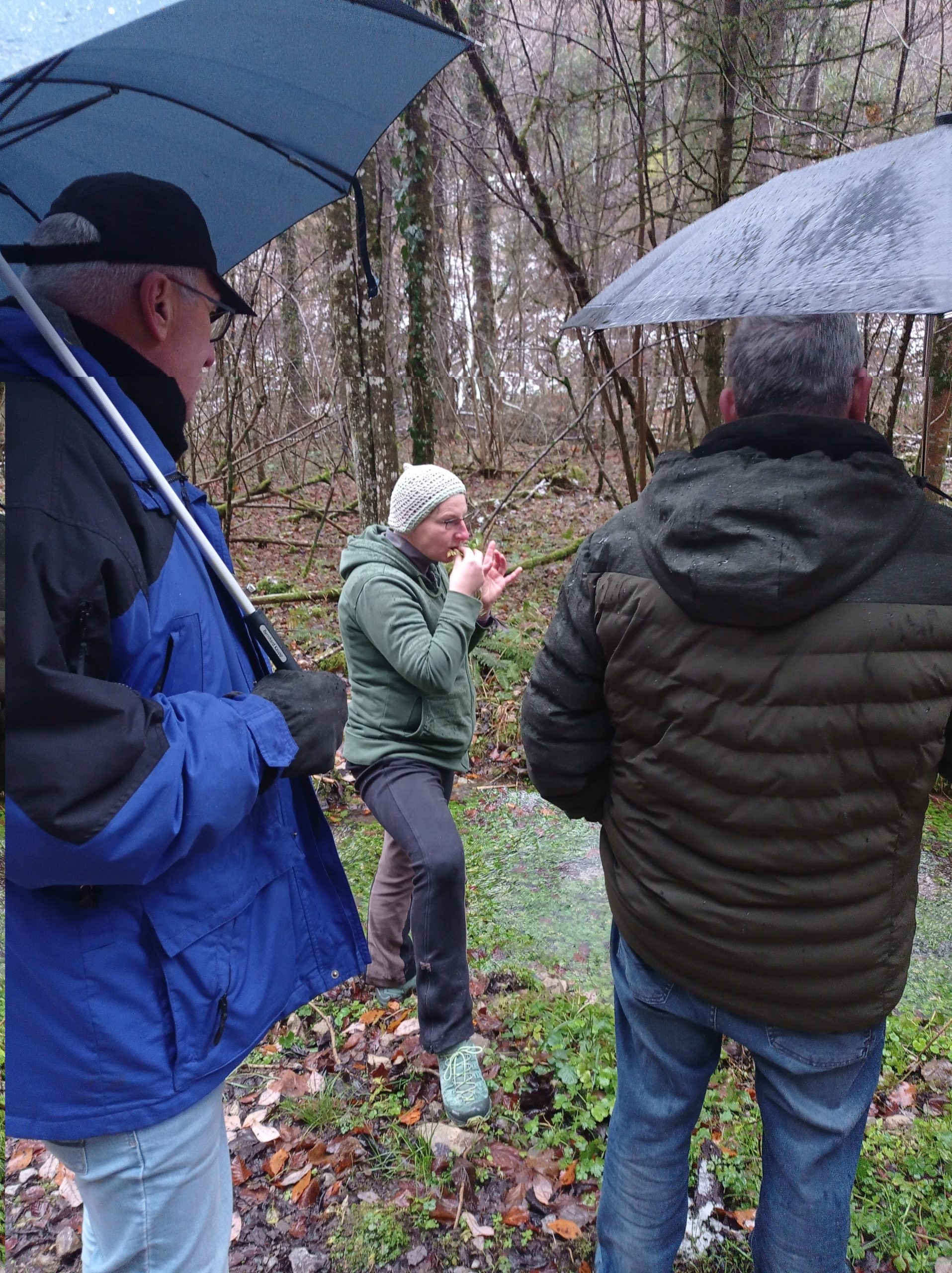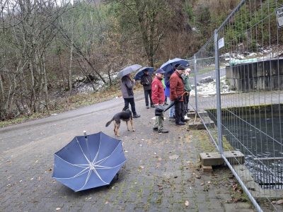 Charme und Mütze bewaffnet machten sich trotzdem acht wackere Wanderer auf den Weg. Und dann nach wenigen Hundert Metern ein Keuchen von hinten. Die eingeteilte Wanderführerin kam angehechelt oder war das ihr Hund? Egal. Lindenwirtin Ines übernahm die Führung und so gelangte man auf dem Wilfried-Meintel-Weg hinüber ins Engental zu den Fischweihern von Forellenzüchter Sohnius.