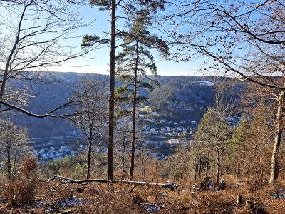 Nicht während des Gehens, denn nasses Laub, glitschige Wurzeln, sowie gefährliche Stolpersteine verlangten höchste Konzentration. Oben am Trauf entlang in Richtung Aistaig erfreuten sich die Wanderer an der tollen Aussicht hinunter ins Neckartal und jenseits des Tales bis hinauf nach Hochmössigen. Hinunter ins Tal, ja stellenweise befand man sich nur Zentimeter von der Kante entfernt, an der es bei einem Fehltritt senkrecht in den sicheren Tod ginge.