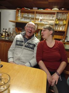 und Ausblicken auf die andere Talseite wieder in Richtung Dießen gewandert werden. Ja und flugs verschwand die Wanderführerin, im Gasthaus Linde ging das Licht an und gemeinsam mit den angereisten Nichtwanderern ließ man sich in der mollig warmen Gaststube nieder. Zack, zack erfüllte die Wirtin in der ihr eigenen direkten Art die Getränke-Wünsche (oder Albrecht?) der Gäste.