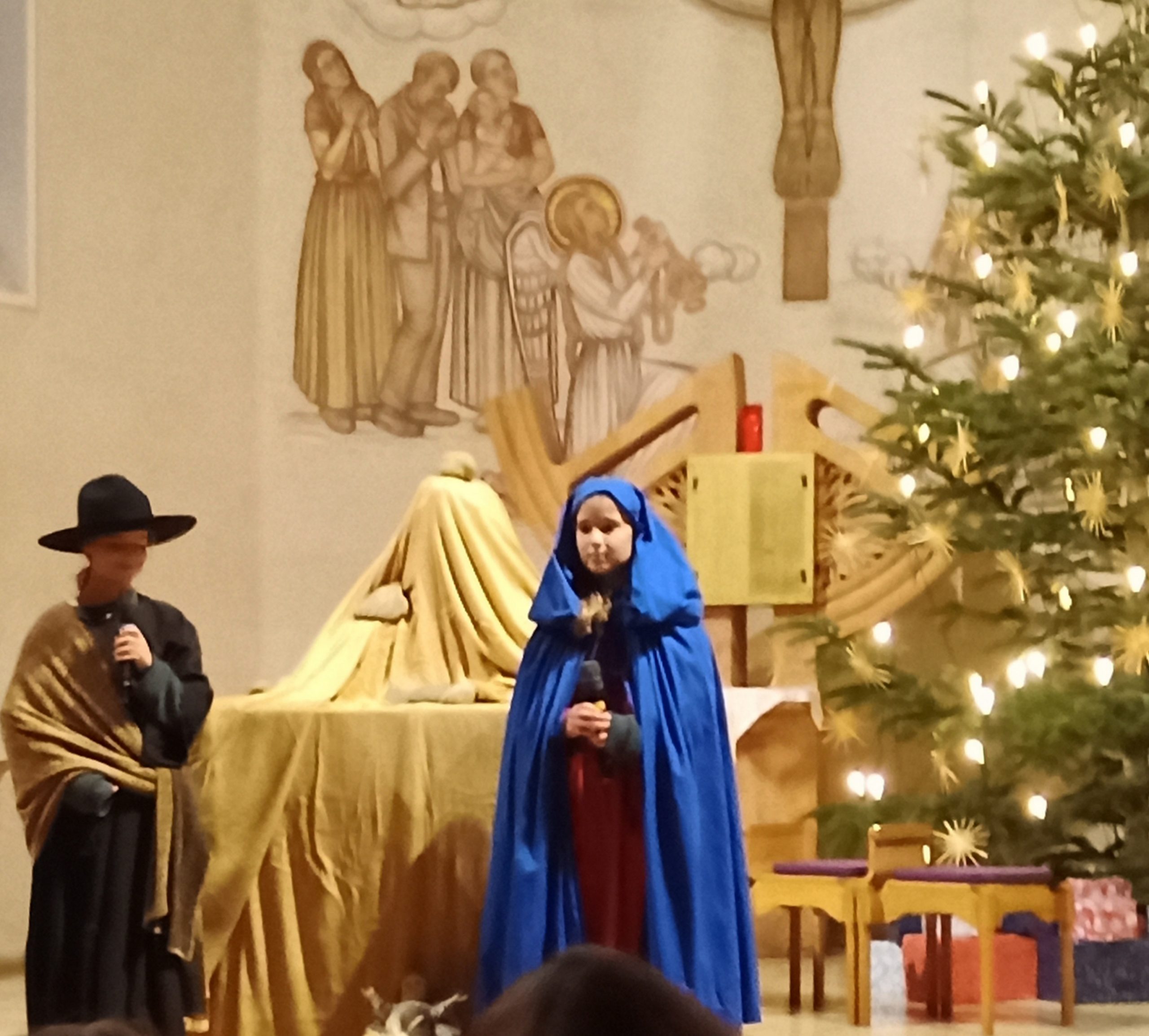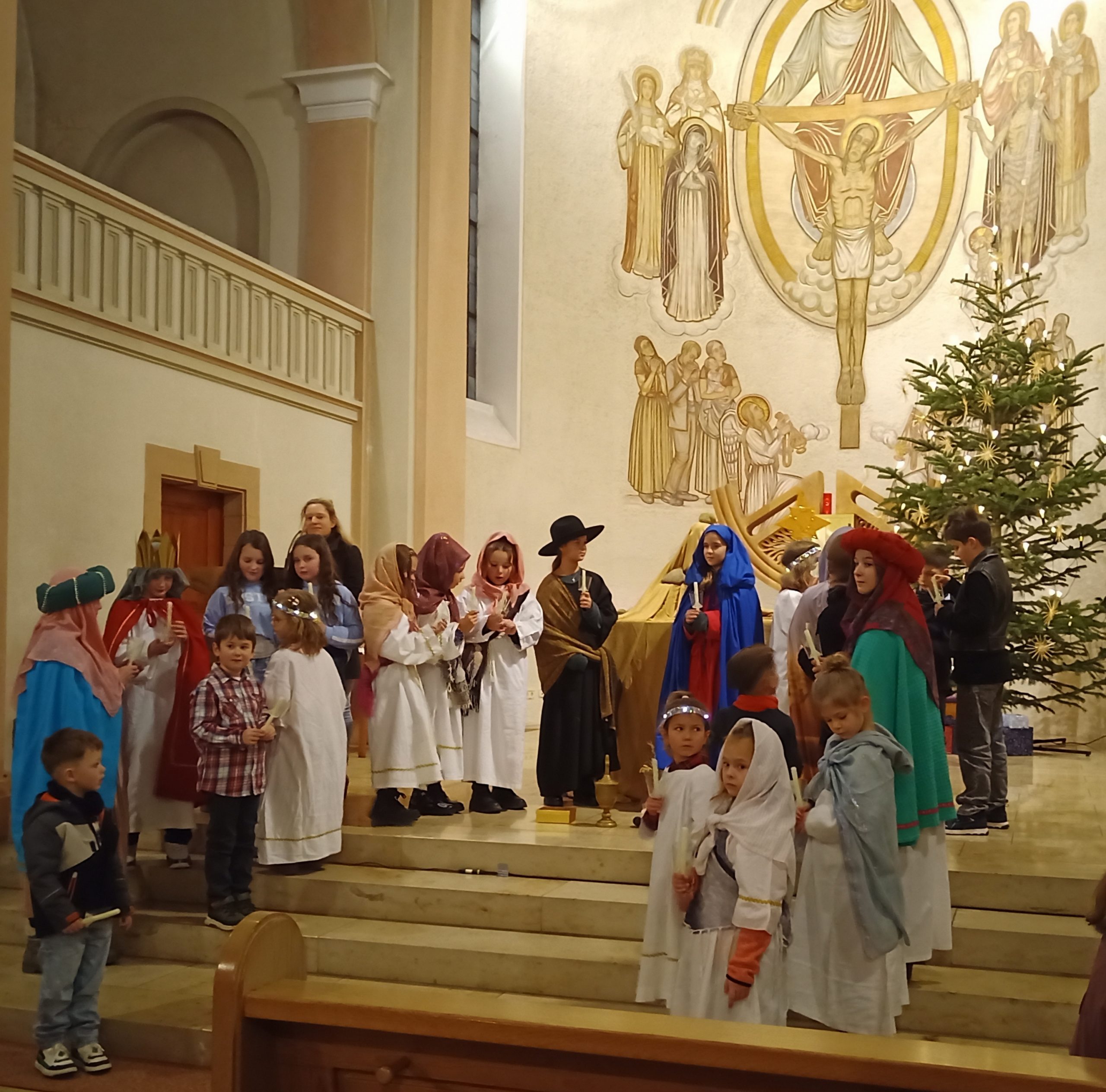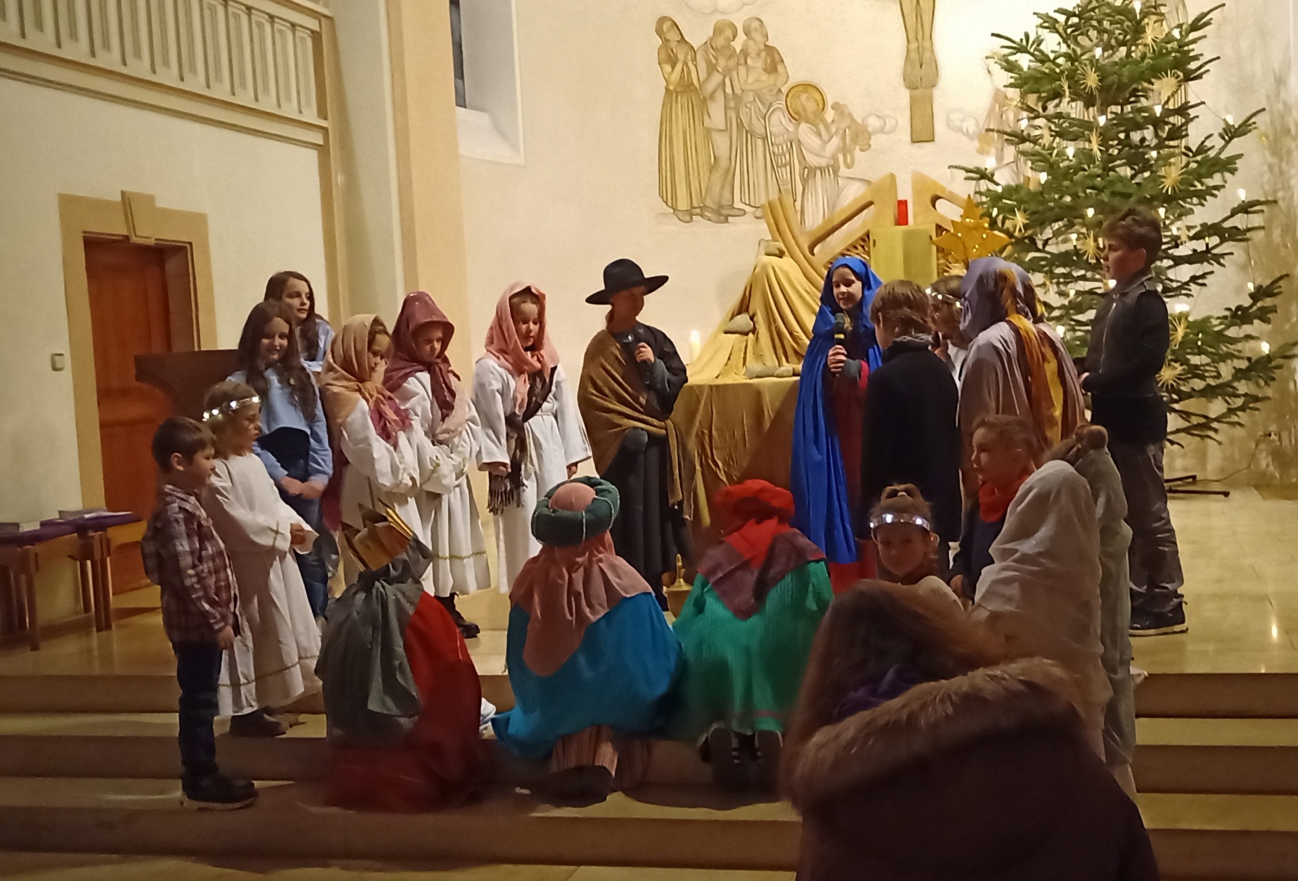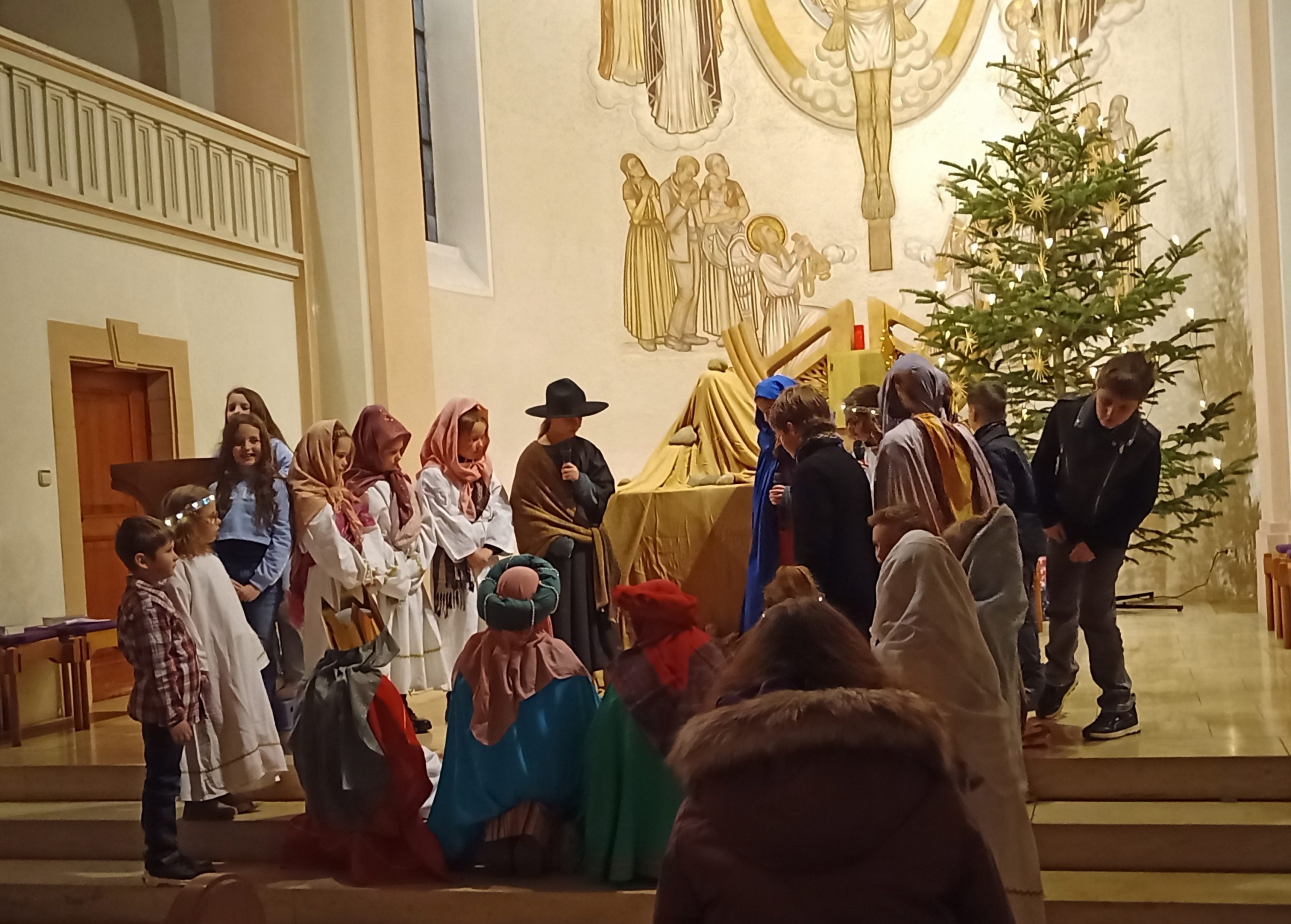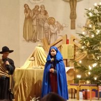 Mit großer Begeisterung zeigten die Kinder das Geschehen auf und zogen die Gäste in ihren Bann. Die Schola, dirigiert und an der Orgel begleitet von Joshua Beuter, waren in die Geschichte mit einbezogen. Das lange Üben seit Mitte November hatte sich gelohnt. Die Besucher zeigten mit riesigem Beifall die Freude und Begeisterung an diesem schönen Krippenspiel.