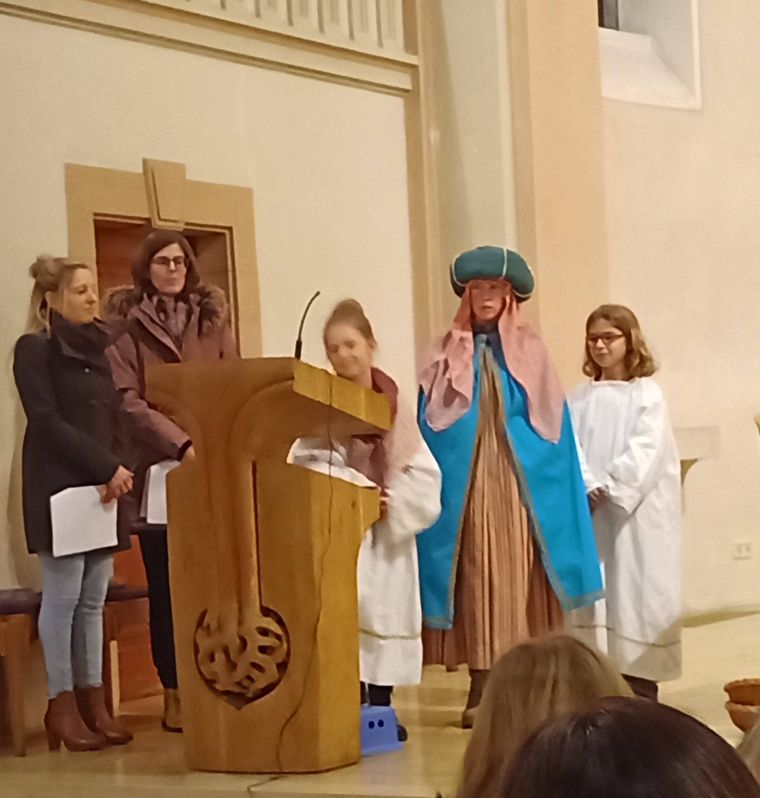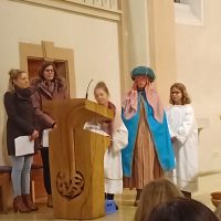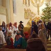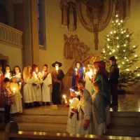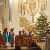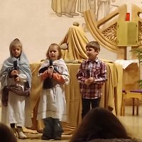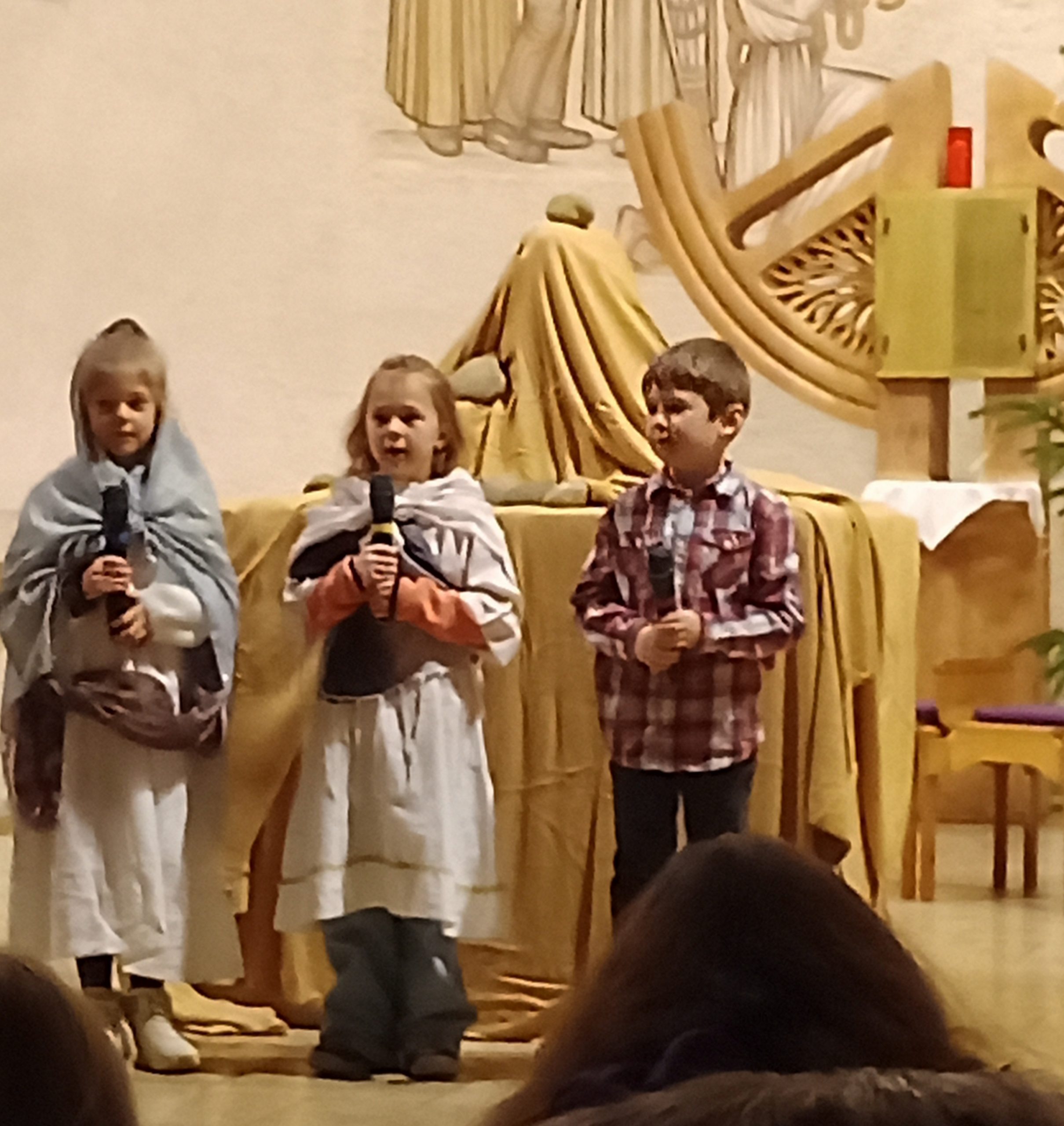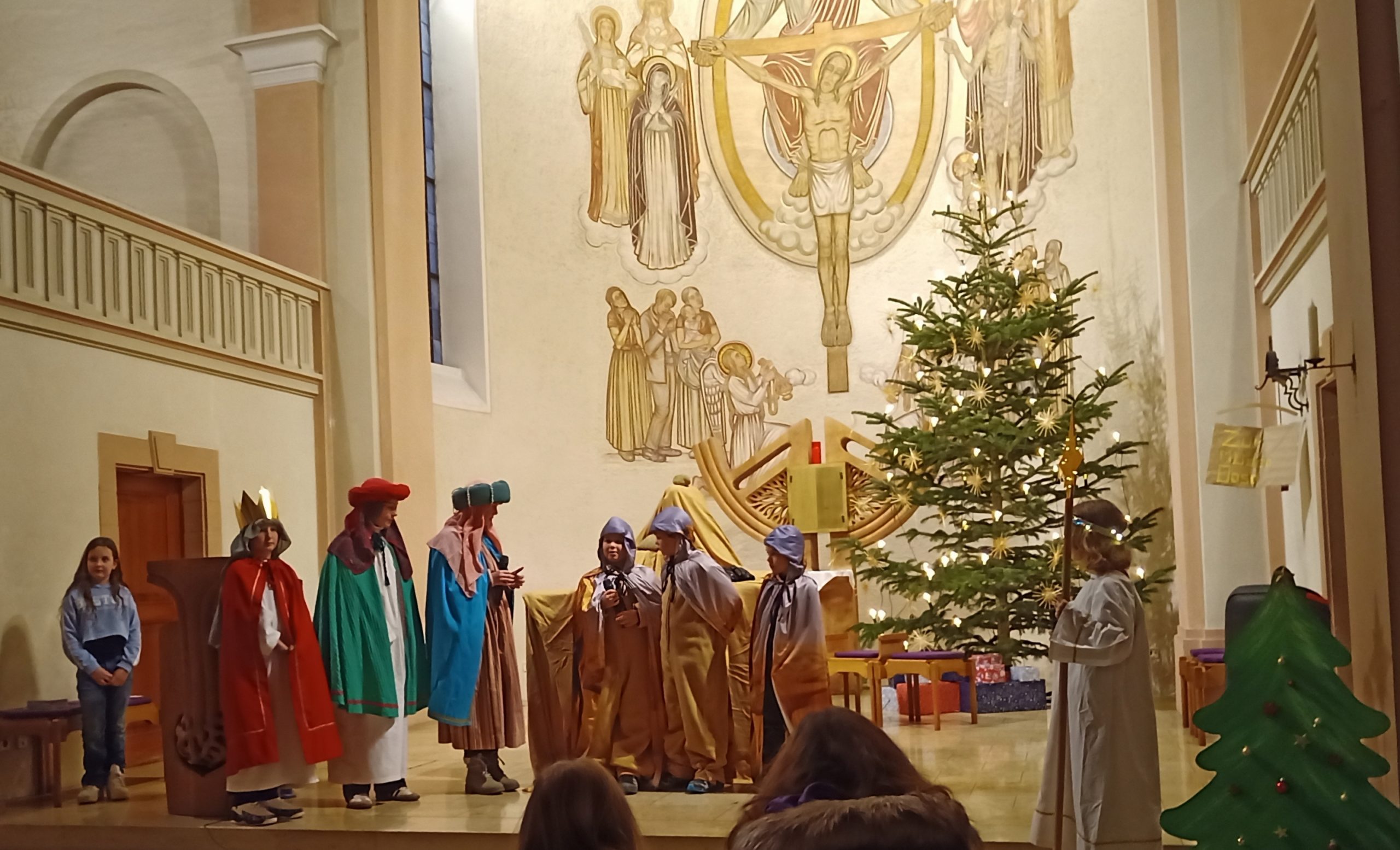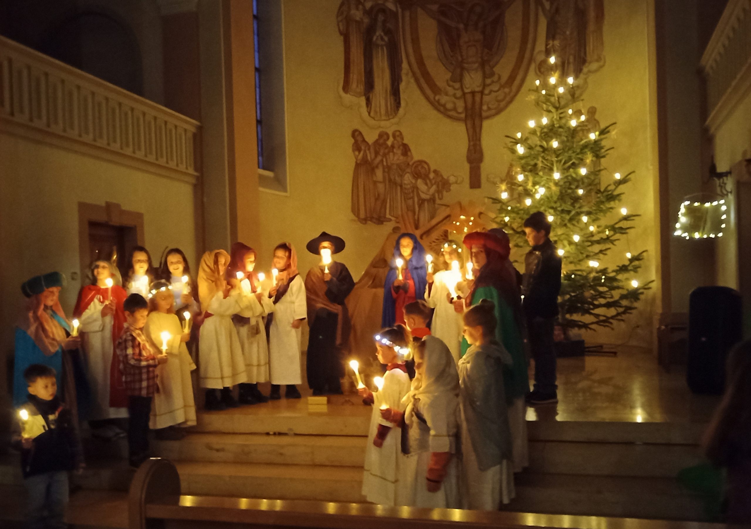 Mit großer Begeisterung zeigten die Kinder das Geschehen auf und zogen die Gäste in ihren Bann. Die Schola, dirigiert und an der Orgel begleitet von Joshua Beuter, waren in die Geschichte mit einbezogen. Das lange Üben seit Mitte November hatte sich gelohnt. Die Besucher zeigten mit riesigem Beifall die Freude und Begeisterung an diesem schönen Krippenspiel.