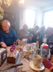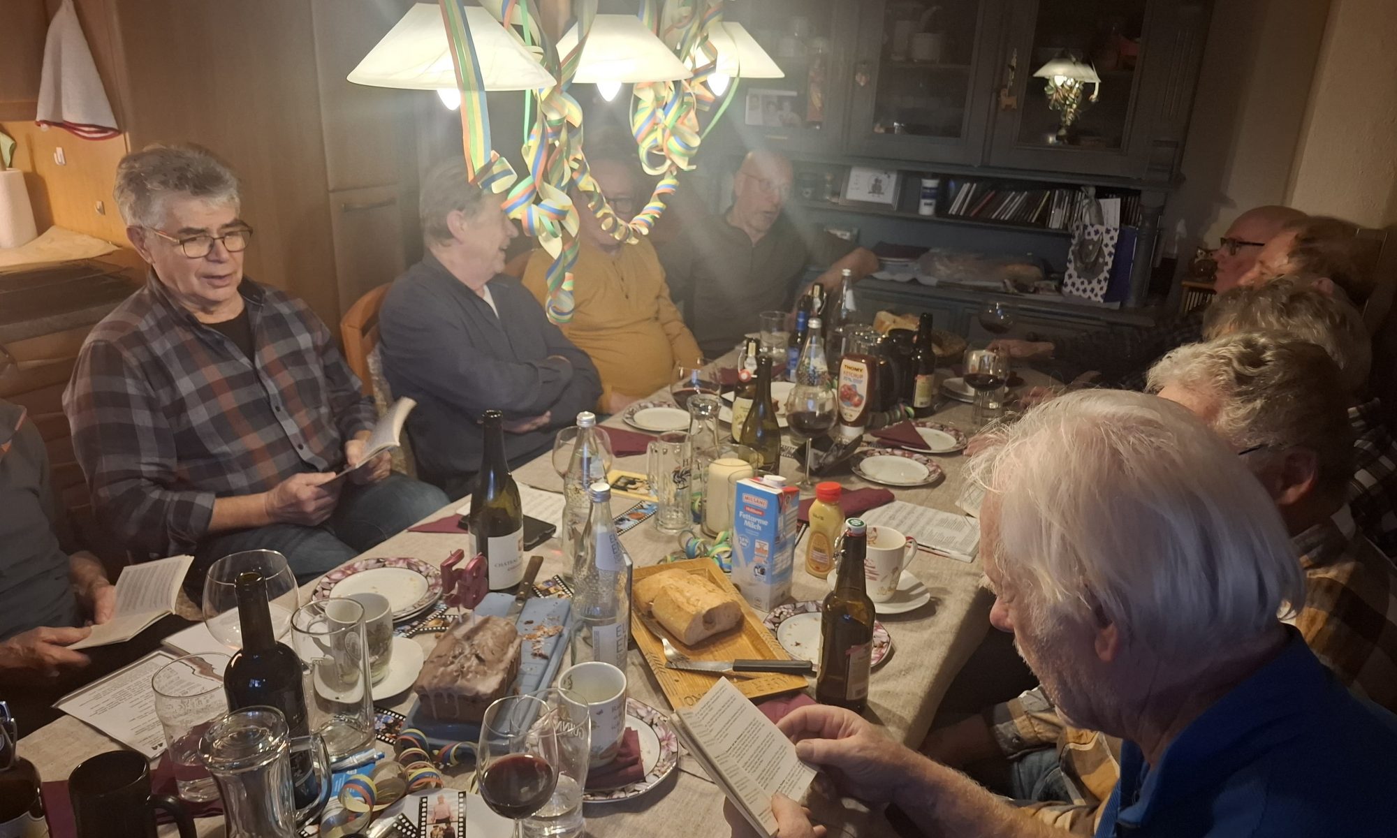 Die Küche war zum Festsaal umgebaut, der Tisch einladend gedeckt, perfekt. Sohnemann Knut hatte bereits Fleischkäselaibe im Backofen, aus dem ein herrlicher Duft herausströmte. A bisle eng gstuahled war’s. Zwei Mann wurden in den Erker gedrückt, einer saß im Türrahmen und irgendwie hatten letztendlich alle einen Platz. Vielstimmig wurde “Zum Geburtstag viel Glück“ gesungen und dann auf den Jubilar angestoßen. Klar, nicht nur ein Mal. Immer und immer wieder. Fleischkäse wurde serviert, Kuchen stand bereit und auch Kaffee für die Kaffeeonkels wurde aufgebrüht.