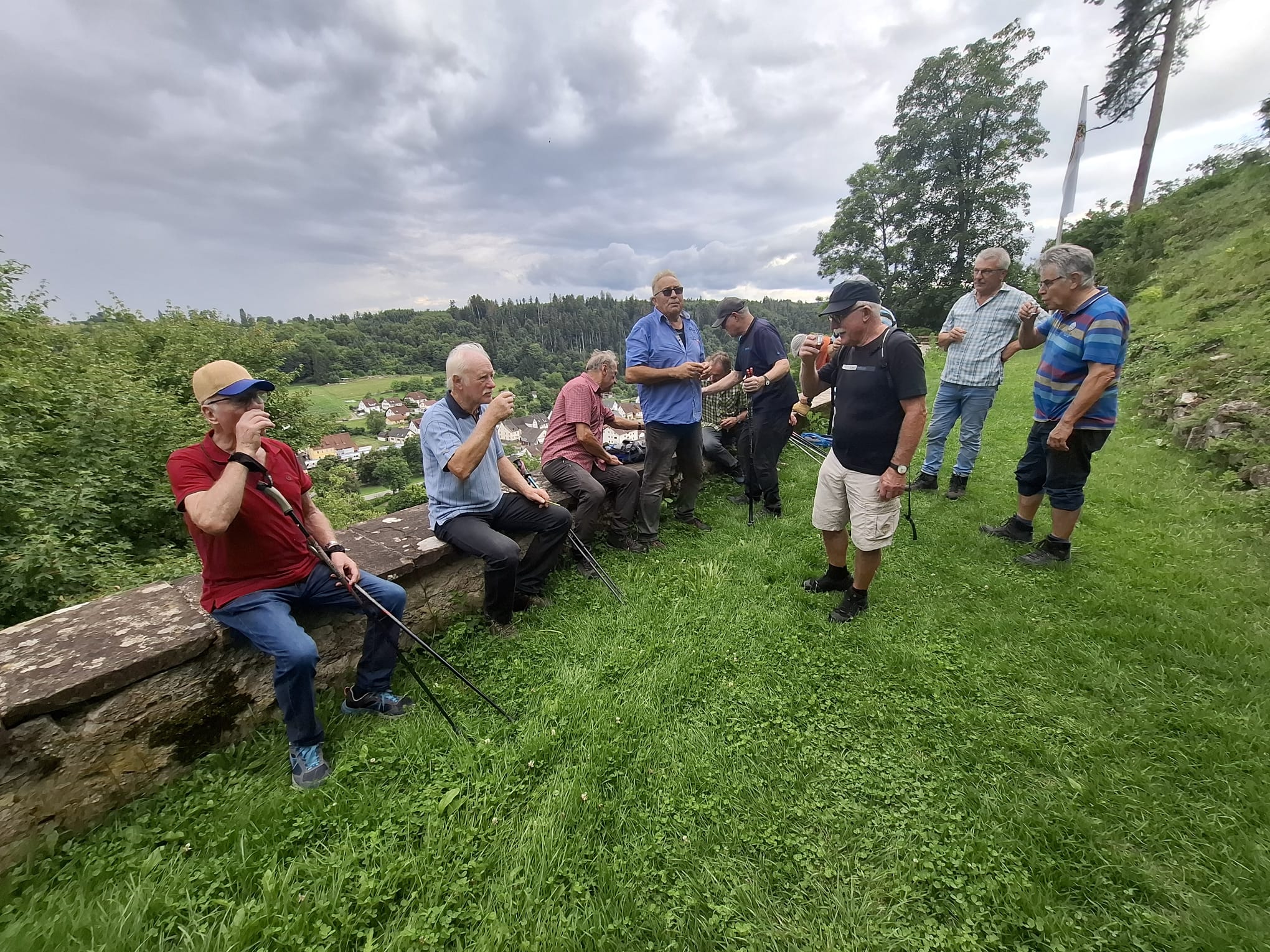 Regentropfen. So ein Mist. Man hätte doch den Schirm mitnehmen sollen. Also auf dem kürzesten Weg zum Sportheim. Nein, nach einem heftigen Disput zwischen Paul und Ludwig setzte sich der Wanderführer durch und blieb nach einem kurzen Schöpfle-Stopp auf der geplanten Route. Ja und diese bescherte den Kameraden am denkmalgeschützten Hofgut Wehrstein, das man eigentlich gar nicht betreten dürfte, einen grandiosen Ausblick hinein in den Steinbruch der Firma Gfrörer. Gewaltig. Gewaltig auch die Ruine der Burg Wehrstein, die von einem Freundeskreis gepflegt wird.