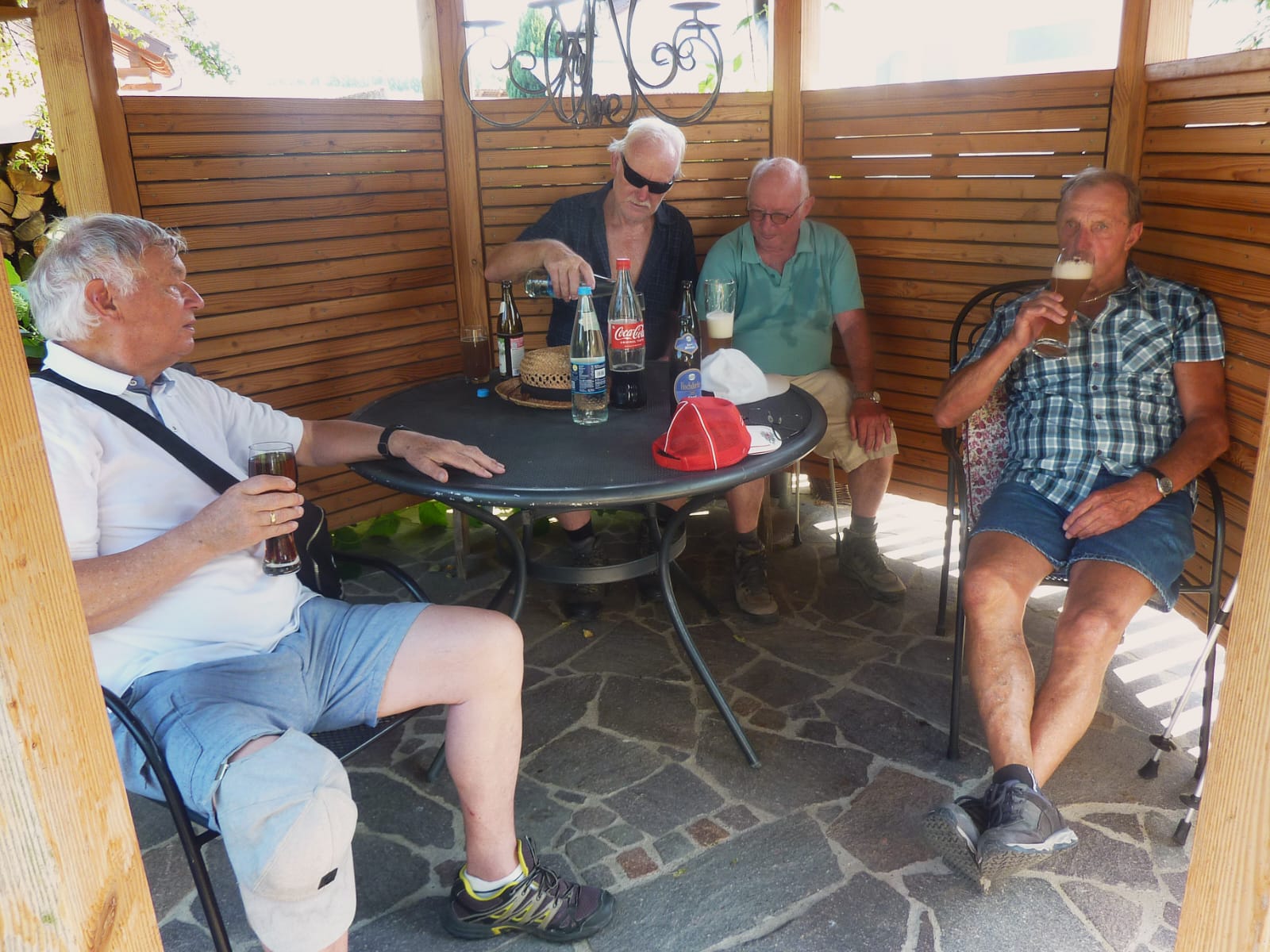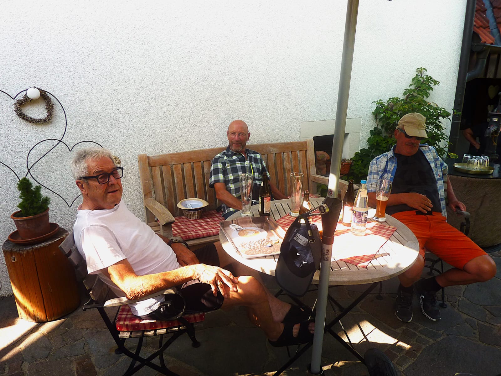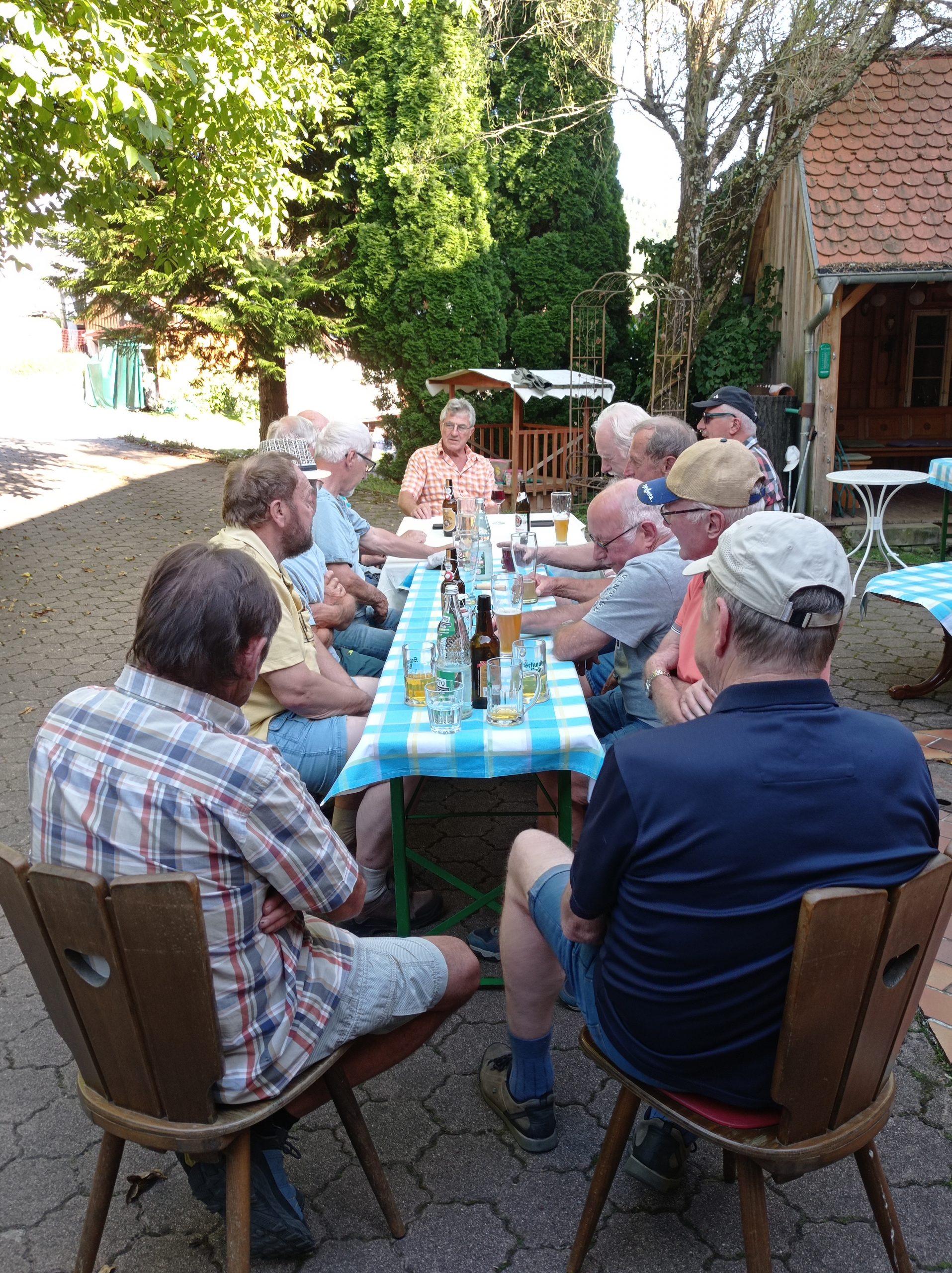 Unspektakulär ging es wieder talwärts und hinein in den schattigen Hof von Wolfgang. Da staunten die Kameraden. Kaffeebar, Pfirschkuchen, Käsekuchen und, man traute seinen Augen nicht, eine Schwarzwälder Kirschtorte. Zuerst wurden aber Bier und Wasser gemischt und damit der unsägliche Durst gelöscht. Sämtliche Wünsche wurden erfüllt, Weizenbier, mit und ohne Alkohol, kalt und net so kalt, Saftschorle, normales Bier, das bei Albrecht überschäumte und den leckeren Boden seiner Schwarzwälder aufweichte. Vielleicht wird in Mettstett statt Kirschwasser Bier in die Torte geschmuggelt. Egal. Letztendlich saßen alle gemütlich mitten im schattigen Hof, dachten auch nach Sonnenuntergang nicht ans Nachhause gehen, aber sie befolgten wenigstens einen oben angeführten Ratschlag: Trinken Sie ausreichend! Ja und dann servierte die Hausfrau leckeren Flammkuchen, ein ganzes Blech und dann noch eines. Dann war alles weggeputzt und somit auch ein weiterer Ratschlag befolgt: Verlegen Sie ihre Aktivitäten in die Abendstunden. Sommerloch, was ist das?