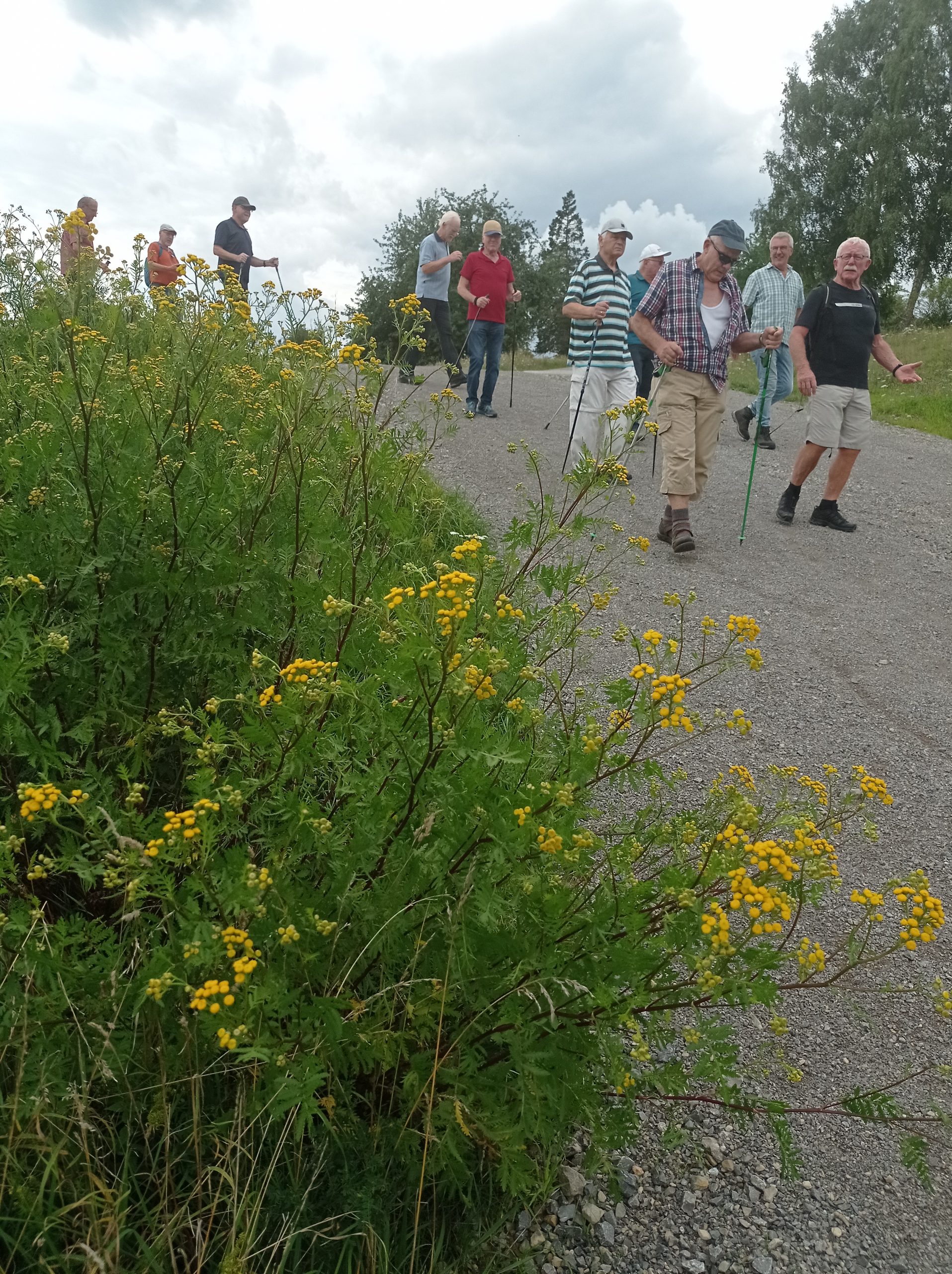 Nach einer kurzen Information über den Streckenverlauf ging es am ehemaligen Motocross-Buckel hinauf nach Empfingen. Keine Spur mehr von den waghalsigen Motorradfahrern aus früheren Zeiten. Ein herrlicher Weg, gesäumt von riesigen Disteln und goldgelbem “gemeinen Rainfarn“, führte hinauf zum Empfinger Tälesee. Zwischen Schilf und Teichrosen schwammen zwei Blesshühner friedlich dahin, während am anderen Ufer auf dem Spielplatz munteres Treiben herrschte. In der Ortsmitte gab es ein kurzes Gespräch mit dem ehemaligen Bürgermeister Schindler, der vermutlich extra auf die Gruppe gewartet hat?! Ehre wem Ehre gebührt.
