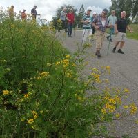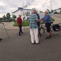 Nach einer kurzen Information über den Streckenverlauf ging es am ehemaligen Motocross-Buckel hinauf nach Empfingen. Keine Spur mehr von den waghalsigen Motorradfahrern aus früheren Zeiten. Ein herrlicher Weg, gesäumt von riesigen Disteln und goldgelbem “gemeinen Rainfarn“, führte hinauf zum Empfinger Tälesee. Zwischen Schilf und Teichrosen schwammen zwei Blesshühner friedlich dahin, während am anderen Ufer auf dem Spielplatz munteres Treiben herrschte. In der Ortsmitte gab es ein kurzes Gespräch mit dem ehemaligen Bürgermeister Schindler, der vermutlich extra auf die Gruppe gewartet hat?! Ehre wem Ehre gebührt.