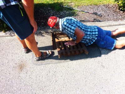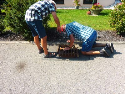 Also auch kein Grund, länger sitzen zu bleiben, zumal in der Anwandstraße noch ein Stopp geplant war. Also, nichts wie hin. Das Tack, Tack der Wanderstöcke wurde plötzlich unterbrochen, denn Hans-Dieter traf mit seiner Gummischoner-Stockspitze genau in den Schlitz des Schachtdeckels. Spitze raus, Schoner weg, au, wenn das früher passiert wäre. Schachtdeckel abgehoben, Hans-Dieter in Bauchlage in der Gosse, Gummi ertastet, weiter.