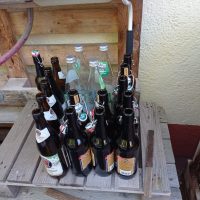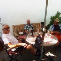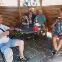 Unspektakulär ging es wieder talwärts und hinein in den schattigen Hof von Wolfgang. Da staunten die Kameraden. Kaffeebar, Pfirschkuchen, Käsekuchen und, man traute seinen Augen nicht, eine Schwarzwälder Kirschtorte. Zuerst wurden aber Bier und Wasser gemischt und damit der unsägliche Durst gelöscht. Sämtliche Wünsche wurden erfüllt, Weizenbier, mit und ohne Alkohol, kalt und net so kalt, Saftschorle, normales Bier, das bei Albrecht überschäumte und den leckeren Boden seiner Schwarzwälder aufweichte. Vielleicht wird in Mettstett statt Kirschwasser Bier in die Torte geschmuggelt. Egal. Letztendlich saßen alle gemütlich mitten im schattigen Hof, dachten auch nach Sonnenuntergang nicht ans Nachhause gehen, aber sie befolgten wenigstens einen oben angeführten Ratschlag: Trinken Sie ausreichend! Ja und dann servierte die Hausfrau leckeren Flammkuchen, ein ganzes Blech und dann noch eines. Dann war alles weggeputzt und somit auch ein weiterer Ratschlag befolgt: Verlegen Sie ihre Aktivitäten in die Abendstunden. Sommerloch, was ist das?