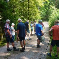 Wieder galt es der Hitze ein Schnippchen zu Schlagen. Am Sportgelände Sigmarswangen folgte man dem HSB, dem Heidelberg- Schwarzwald-Bodensee-Radweg. Zu Fuß, wie immer. Nach einem Kilometer endlich ein schattenspendender Laubbaum, unter ausladenden Ästen ein Sitzbänkle, erster Hitzschlag abgewendet. Weiter. In Sichtweite der nächste Bänklestopp. Dann endlich hinein in den schattigen Wald. Herrlich ging es dahin. Links unten eine kleine Schlucht, die vor Jahren von den DienstagsWanderern durchquert wurde. Ruine Albeck war angeschrieben und somit durfte man entspannt dahinwandern. Sigmarswangen, Parkplatz, Spielplatz, Sitzplätze im Schatten. Da saß man nun, kein Bier, kein Wasser, kein Garnichts.